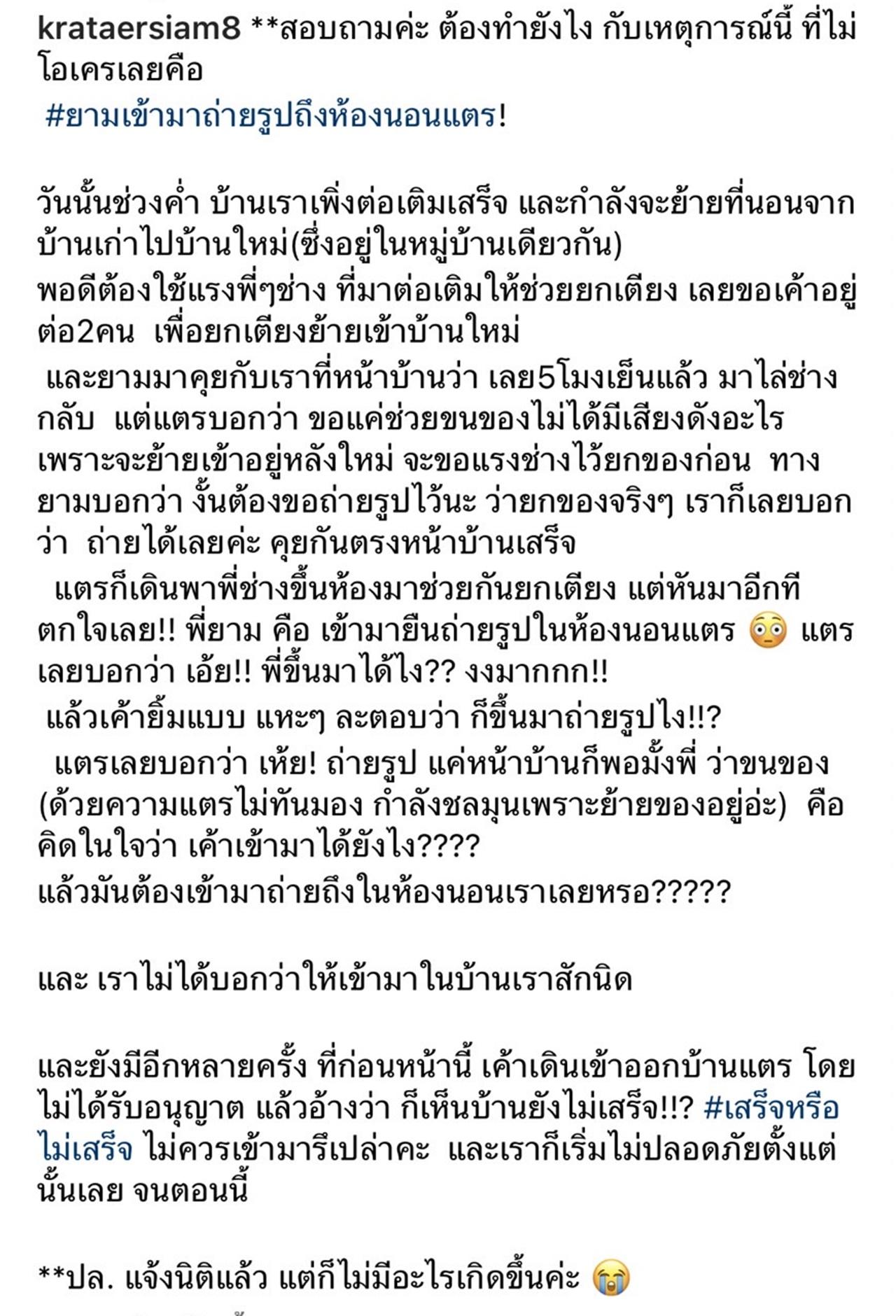 และยังมีอีกหลายครั้ง ที่ก่อนหน้านี้เขาเดินเข้าออกบ้านแตร โดยไม่ได้รับอนุญาต แล้วอ้างว่าก็เห็นบ้านยังไม่เสร็จ!!? #เสร็จหรือไม่เสร็จ ไม่ควรเข้ามารึเปล่าคะ และเราก็เริ่มไม่ปลอดภัยตั้งแต่นั้นเลย จนตอนนี้ **ป.ล. แจ้งนิติแล้ว แต่ก็ไม่มีอะไรเกิดขึ้นค่ะ"