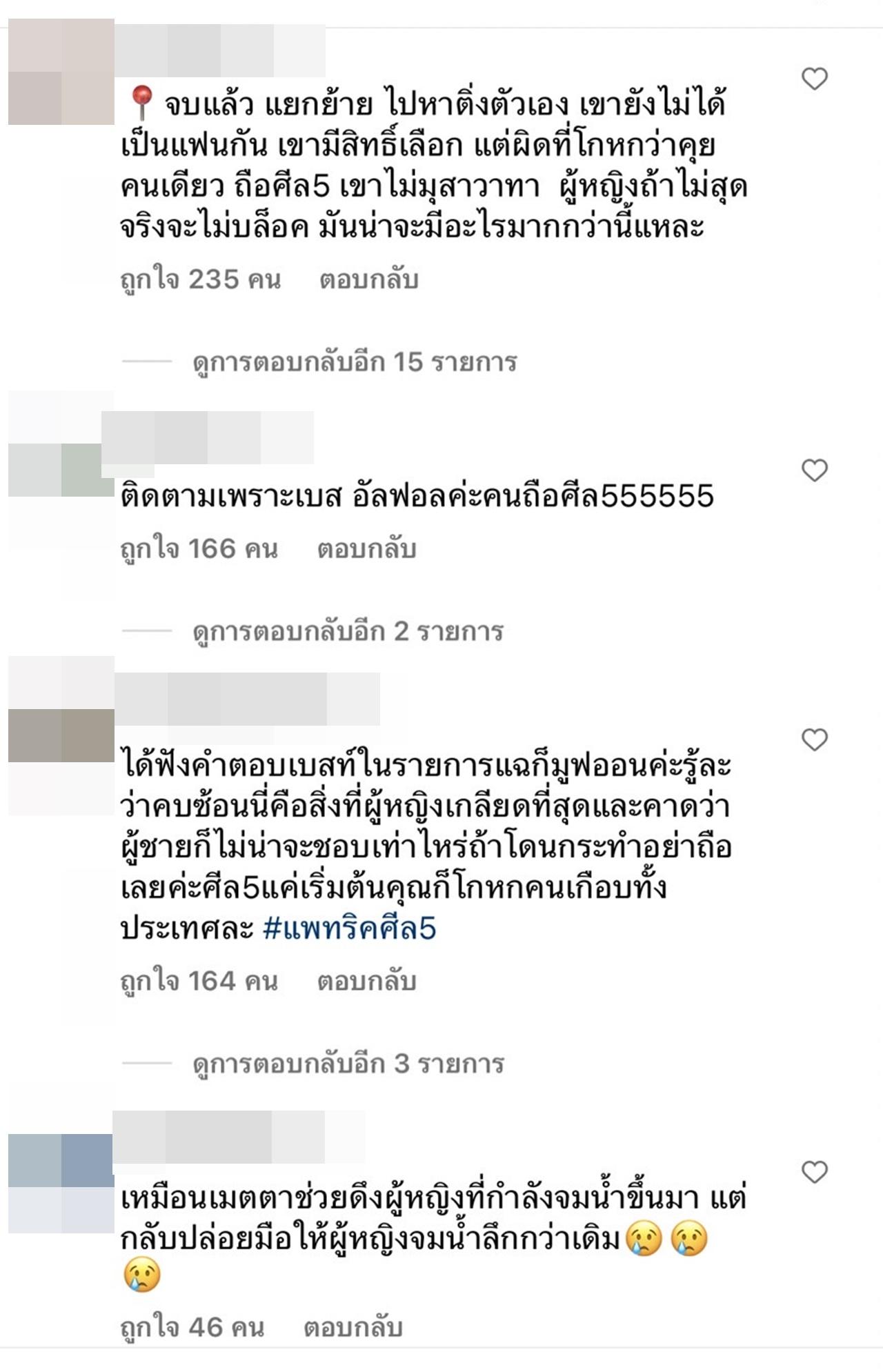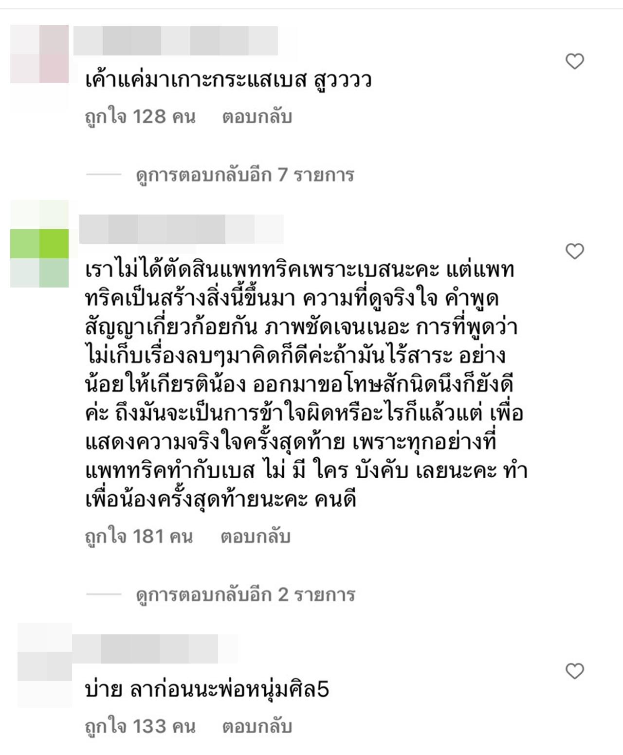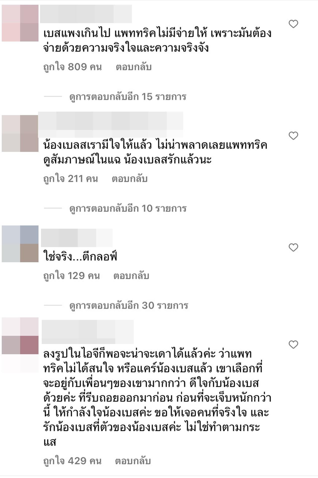 - ลงรูปในไอจีก็พอจะน่าจะเดาได้แล้วค่ะ ว่าแพททริคไม่ได้สนใจ หรือแคร์น้องเบสแล้ว เขาเลือกที่จะอยู่กับเพื่อนๆของเขามากกว่า ดีใจกับน้องเบสด้วยค่ะ ที่รีบถอยออกมาก่อน ก่อนที่จะเจ็บหนักกว่านี้ ให้กำลังใจน้องเบสค่ะ ขอให้เจอคนที่จริงใจ และรักน้องเบสที่ตัวของน้องเบสค่ะ ไม่ใช่ทำตามกระแส