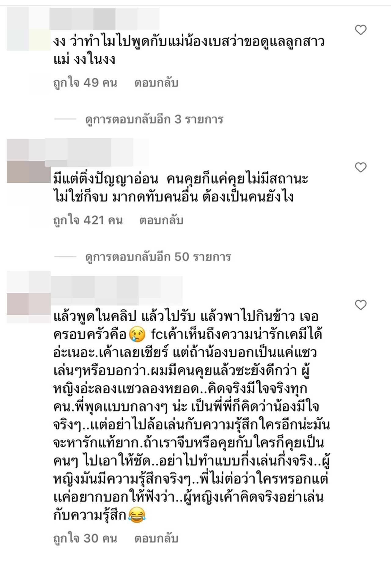 - แล้วพูดในคลิป แล้วไปรับ แล้วพาไปกินข้าว เจอครอบครัวคือ fcเค้าเห็นถึงความน่ารักเคมีได้อ่ะเนอะ.เค้าเลยเชียร์ แต่ถ้าน้องบอกเป็นแค่แซวเล่นๆหรือบอกว่า.ผมมีคนคุยแล้วซะยังดีกว่า ผู้หญิงอ่ะลองเเซวลองหยอด..คิดจริงมีใจจริงทุกคน.พี่พุดเเบบกลางๆ น่ะ เป็นพี่พี่ก็คิดว่าน้องมีใจจริงๆ..เเต่อย่าไปล้อเล่นกับความรุ้สึกใครอีกน่ะมันจะหารักแท้ยาก.ถ้าเราจีบหรือคุยกับใครก็คุยเป็นคนๆ ไปเอาให้ชัด..อย่าไปทำแบบกึ่งเล่นกึ่งจริง..ผู้หญิงมันมีความรุ้สึกจริงๆ..พี่ไม่ต่อว่าใครหรอกแต่เเค่อยากบอกให้ฟังว่า..ผู้หญิงเค้าคิดจริงอย่าเล่นกับความรุ้สึก