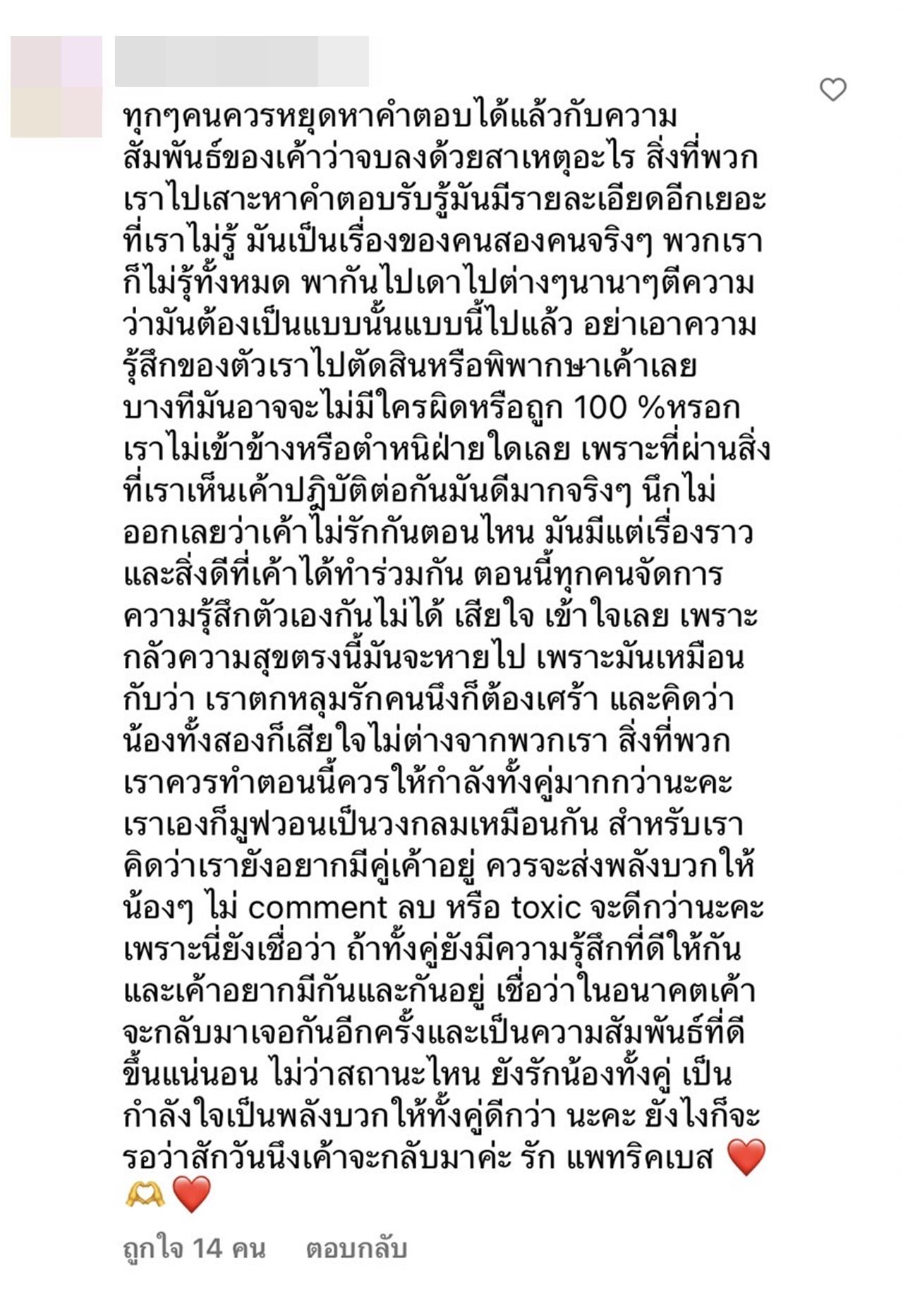 - ทุกๆคนควรหยุดหาคำตอบได้แล้วกับความสัมพันธ์ของเค้าว่าจบลงด้วยสาเหตุอะไร สิ่งที่พวกเราไปเสาะหาคำตอบรับรู้มันมีรายละเอียดอีกเยอะที่เราไม่รู้ มันเป็นเรื่องของคนสองคนจริงๆ พวกเราก็ไม่รุ้ทั้งหมด พากันไปเดาไปต่างๆนานาๆตีความว่ามันต้องเป็นแบบนั้นแบบนี้ไปแล้ว อย่าเอาความรุ้สึกของตัวเราไปตัดสินหรือพิพากษาเค้าเลย บางทีมันอาจจะไม่มีใครผิดหรือถูก 100 %หรอก เราไม่เข้าข้างหรือตำหนิฝ่ายใดเลย เพราะที่ผ่านสิ่งที่เราเห็นเค้าปฎิบัติต่อกันมันดีมากจริงๆ นึกไม่ออกเลยว่าเค้าไม่รักกันตอนไหน มันมีแต่เรื่องราวและสิ่งดีที่เค้าได้ทำร่วมกัน ตอนนี้ทุกคนจัดการความรุ้สึกตัวเองกันไม่ได้ เสียใจ เข้าใจเลย เพราะกลัวความสุขตรงนี้มันจะหายไป เพราะมันเหมือนกับว่า เราตกหลุมรักคนนึงก็ต้องเศร้า และคิดว่าน้องทั้งสองก็เสียใจไม่ต่างจากพวกเรา สิ่งที่พวกเราควรทำตอนนี้ควรให้กำลังทั้งคู่มากกว่านะคะ เราเองก็มูฟวอนเป็นวงกลมเหมือนกัน สำหรับเราคิดว่าเรายังอยากมีคู่เค้าอยู่ ควรจะส่งพลังบวกให้น้องๆ ไม่ comment ลบ หรือ toxic จะดีกว่านะคะ เพราะนี่ยังเชื่อว่า ถ้าทั้งคู่ยังมีความรุ้สึกที่ดีให้กัน และเค้าอยากมีกันและกันอยู่ เชื่อว่าในอนาคตเค้าจะกลับมาเจอกันอีกครั้งและเป็นความสัมพันธ์ที่ดีขึ้นแน่นอน ไม่ว่าสถานะไหน ยังรักน้องทั้งคู่ เป็นกำลังใจเป็นพลังบวกให้ทั้งคู่ดีกว่า นะคะ ยังไงก็จะรอว่าสักวันนึงเค้าจะกลับมาค่ะ รัก แพทริคเบส