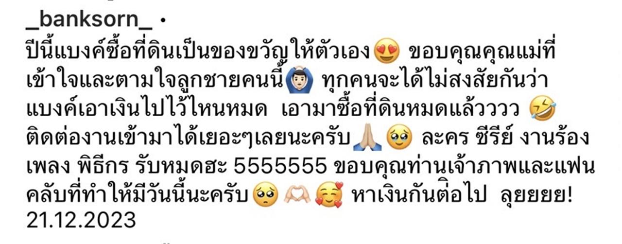 "ปีนี้แบงค์ซื้อที่ดินเป็นของขวัญให้ตัวเอง ขอบคุณคุณแม่ที่เข้าใจและตามใจลูกชายคนนี้ ทุกคนจะได้ไม่สงสัยกันว่า แบงค์เอาเงินไปไว้ไหนหมด เอามาซื้อที่ดินหมดแล้วววว ติดต่องานเข้ามาได้เยอะๆ เลยนะครับ ละคร ซีรีย์ งานร้องเพลง พิธีกร รับหมดฮะ 5555555 ขอบคุณท่านเจ้าภาพและแฟนคลับที่ทำให้มีวันนี้นะครับ หาเงินกันต่อไป ลุยยยย! 21.12.2023"