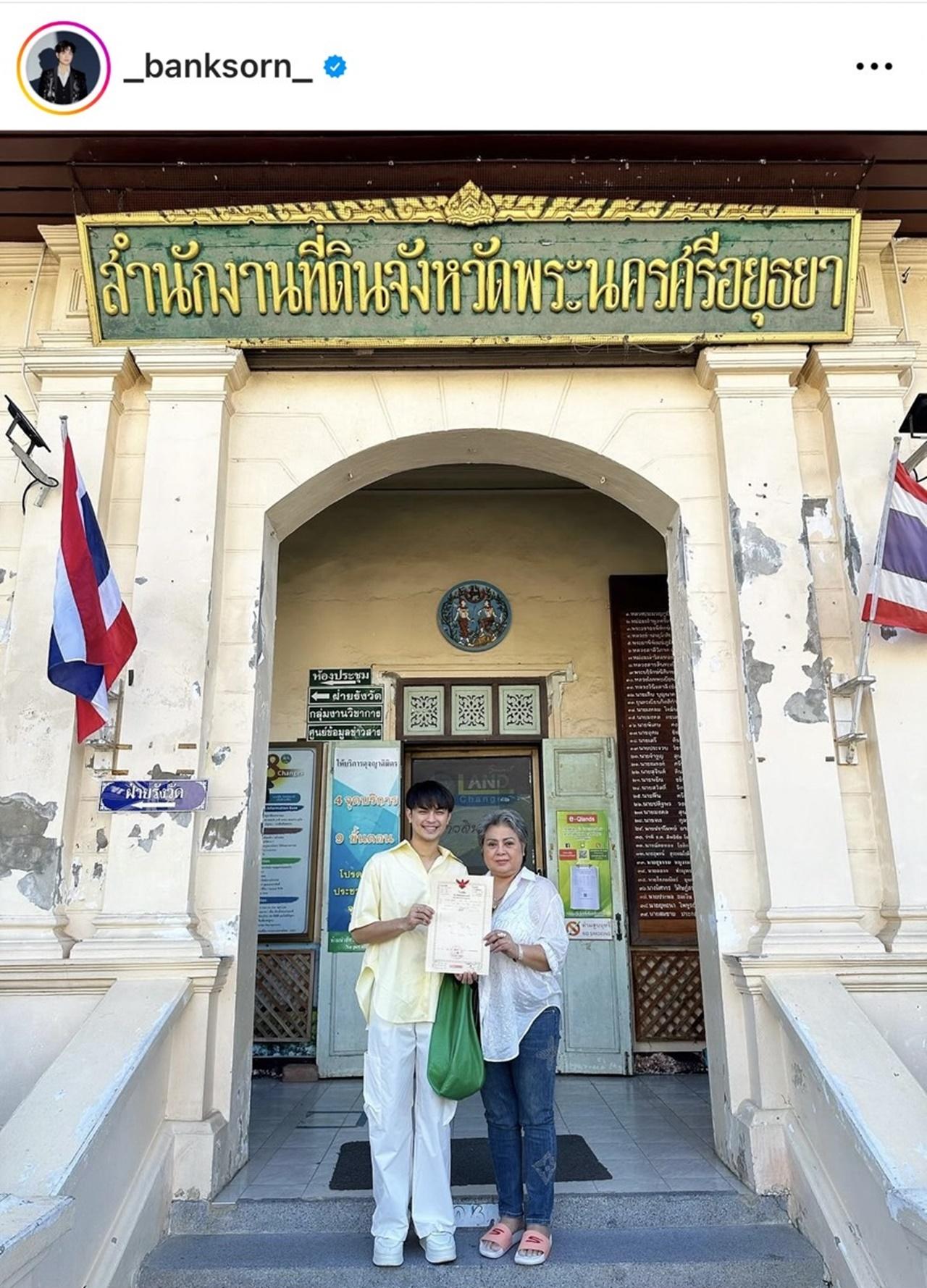 โดย แบงค์ ศรราม ได้โพสต์ภาพกับคุณแม่พร้อมโฉนดที่ดิน ที่อยู่หน้าสำนักงานที่ดินจังหวัดอยุธยา และเขียนแคปชั่นว่า