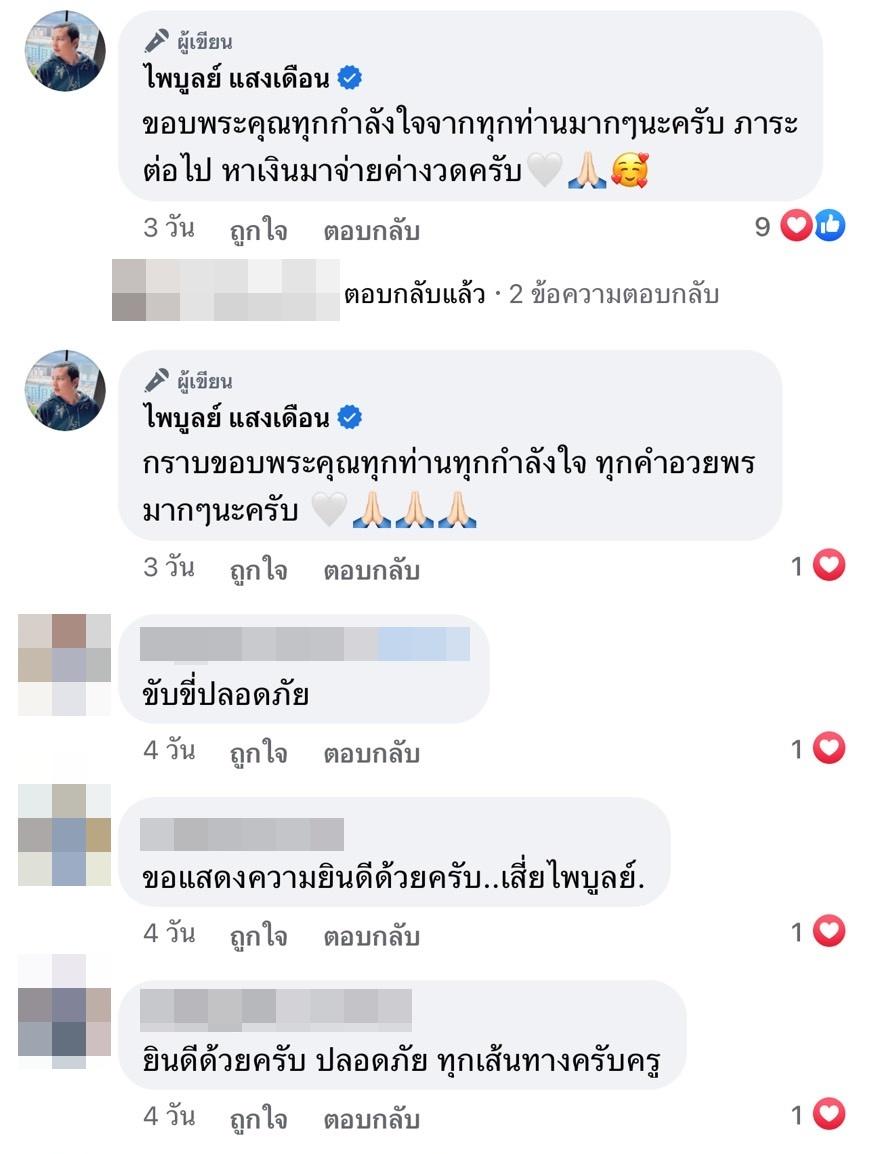 ก่อนจะคอมเมนต์ใต้ภาพเพิ่มเติมว่า “ขอบพระคุณทุกกำลังใจจากทุกท่านมากๆนะครับ ภาระต่อไป หาเงินมาจ่ายค่างวดครับ” และ “กราบขอบพระคุณทุกท่านทุกกำลังใจ ทุกคำอวยพรมากๆนะครับ”
