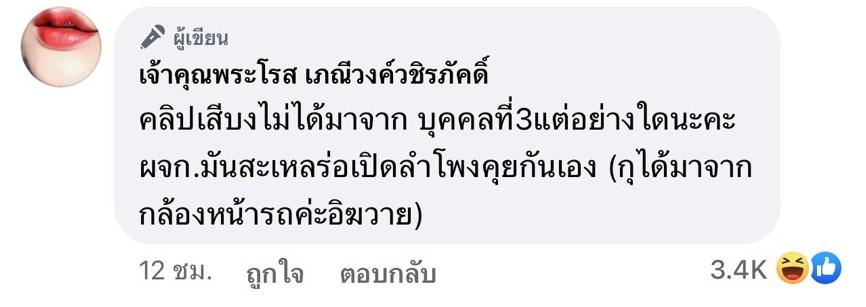นอกจากนี้ เพจดังกล่าวยังโพสต์คอมเมนต์เล่าถึงที่มาของคลิปเสียงนี้ว่า “คลิปเสียงไม่ได้มาจาก บุคคลที่ 3 แต่อย่างใดนะคะ ผจก.มันสะเหร่อเปิดลำโพงคุยกันเอง (กุได้มาจากกล้องหน้ารถค่ะอิฆวาย)”.