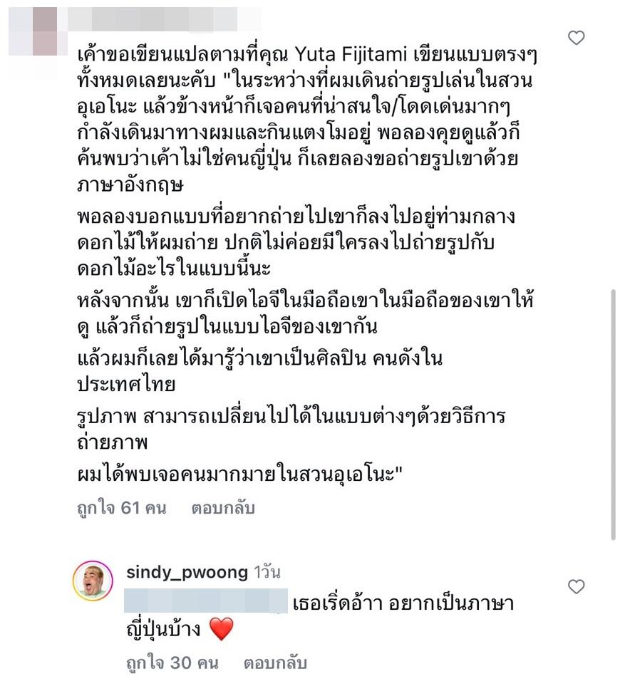 พอลองบอกแบบที่อยากถ่ายไปเขาก็ลงไปอยู่ท่ามกลางดอกไม้ให้ผมถ่าย ปกติไม่ค่อยมีใครลงไปถ่ายรูปกับดอกไม้อะไรในแบบนี้นะ หลังจากนั้น เขาก็เปิดไอจีในมือถือเขาในมือถือของเขาให้ดู แล้วก็ถ่ายรูปในแบบไอจีของเขากัน แล้วผมก็เลยได้มารู้ว่าเขาเป็นศิลปิน คนดังในประเทศไทย รูปภาพสามารถเปลี่ยนไปได้ในแบบต่างๆ ด้วยวิธีการถ่ายภาพ ผมได้พบเจอคนมากมายในสวนอุเอโนะ”.