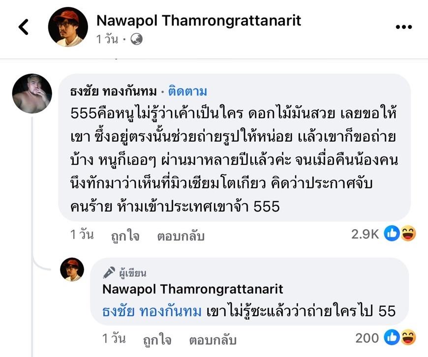 หลังจากนั้น ปิงปอง ก็ได้เข้ามาคอมเมนต์อธิบายถึงที่มาของภาพเซตนี้ว่า “555 คือหนูไม่รู้ว่าเค้าเป็นใคร ดอกไม้มันสวย เลยขอให้เขาซึ่งอยู่ตรงนั้นช่วยถ่ายรูปให้หน่อย เเล้วเขาก็ขอถ่ายบ้าง หนูก็เออๆ ผ่านมาหลายปีเเล้วค่ะ จนเมื่อคืนน้องคนนึงทักมาว่าเห็นที่มิวเซียมโตเกียว คิดว่าประกาศจับคนร้าย ห้ามเข้าประเทศเขาจ้า 555”