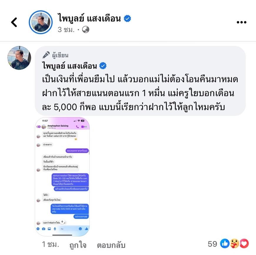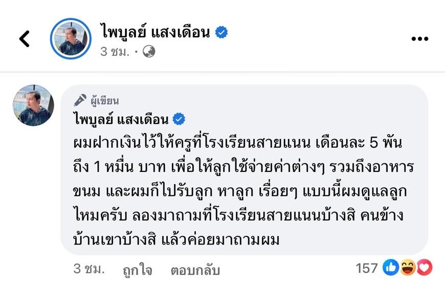 ก่อนจะโพสต์ภาพแคปข้อความแชตสนทนา และเขียนข้อความว่า “เป็นเงินที่เพื่อนยืมไป แล้วบอกแม่ไม่ต้องโอนคืนมาหมด ฝากไว้ให้สายแนนตอนแรก 1 หมื่น แม่ครูใยบอกเดือนละ 5,000 ก็พอ แบบนี้เรียกว่าฝากไว้ให้ลูกไหมครับ” และคอมเมนต์เพิ่มเติมว่า “ผมฝากเงินไว้ให้ครูที่โรงเรียนสายแนน เดือนละ 5 พัน ถึง 1 หมื่นบาท เพื่อให้ลูกใช้จ่ายค่าต่างๆ รวมถึงอาหาร ขนม และผมก็ไปรับลูก หาลูก เรื่อยๆ แบบนี้ผมดูแลลูกไหมครับ ลองมาถามที่โรงเรียนสายแนนบ้างสิ คนข้างบ้านเขาบ้างสิ แล้วค่อยมาถามผม”.