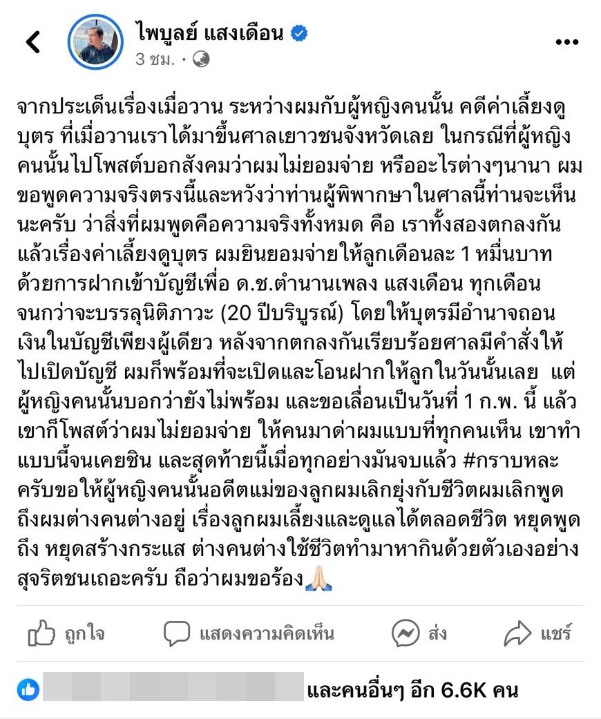 ล่าสุด ครูไพบูลย์ แสงเดือน อดีตสามีของ เอ๋ มิรา ได้โพสต์ข้อความชี้แจงถึงเรื่องคดีค่าเลี้ยงดูบุตรว่า “จากประเด็นเรื่องเมื่อวาน ระหว่างผมกับผู้หญิงคนนั้น คดีค่าเลี้ยงดูบุตร ที่เมื่อวานเราได้มาขึ้นศาลเยาวชนจังหวัดเลย ในกรณีที่ผู้หญิงคนนั้นไปโพสต์บอกสังคมว่าผมไม่ยอมจ่าย หรืออะไรต่างๆ นานา