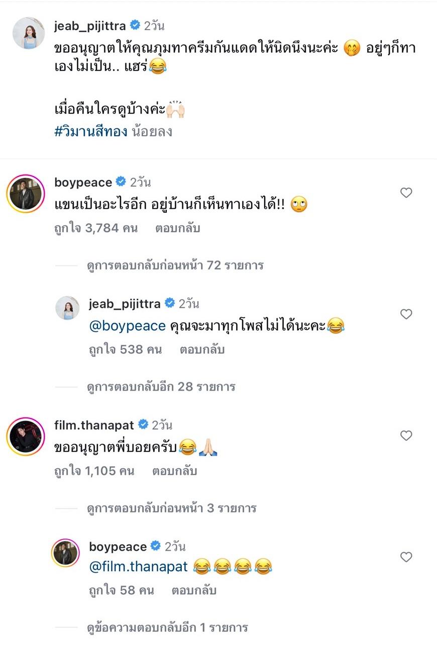 ด้านคุณสามีของเจี๊ยบอย่างนักร้องหนุ่ม บอย พีซเมคเกอร์ ก็อดแซวภรรยาไม่ได้ คอมเมนต์บอกว่า “แขนเป็นอะไรอีก อยู่บ้านก็เห็นทาเองได้!!” และใส่อีโมจิมองบน ทำเอา เจี๊ยบ ถึงกับตอบกลับว่า “คุณจะมาทุกโพสต์ไม่ได้นะคะ” และใส่อีโมจิขำน้ำตาไหล งานนี้แฟนๆ ต่างคอมเมนต์แซวรัวๆ ด้าน ฟิล์ม ธนภัทร ก็รีบคอมเมนต์บอกว่า “ขออนุญาตพี่บอยครับ” ก่อนที่ บอย คอมเมนต์กลับเป็นอีโมจิขำน้ำตาไหลด้วย.