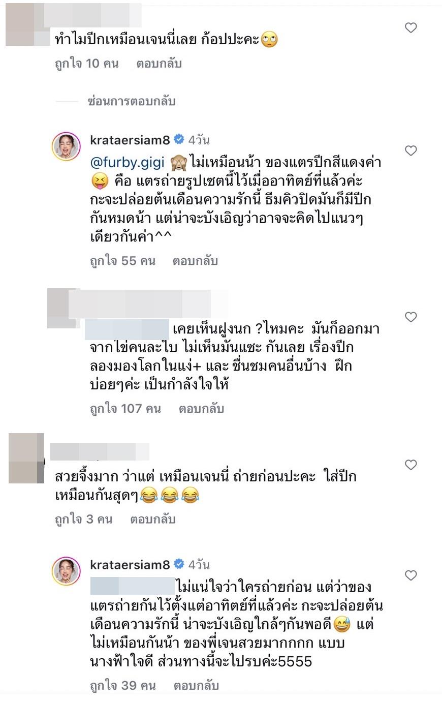 รวมถึงคอมเมนต์ที่บอกว่า “สวยจึ้งมาก ว่าแต่ เหมือนเจนนี่ ถ่ายก่อนปะคะ ใส่ปีกเหมือนกันสุดๆ” และ กระแต ก็ตอบกลับว่า “ไม่แน่ใจว่าใครถ่ายก่อน แต่ว่าของแตรถ่ายกันไว้ตั้งแต่อาทิตย์ที่แล้วค่ะ กะจะปล่อยต้นเดือนความรักนี้ น่าจะบังเอิญใกล้ๆ กันพอดี แต่ไม่เหมือนกันน้า ของพี่เจนสวยมากกกก แบบนางฟ้าใจดี ส่วนทางนี้จะไปรบค่ะ 5555”.
