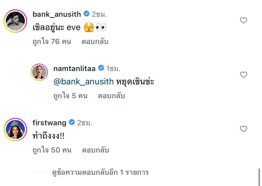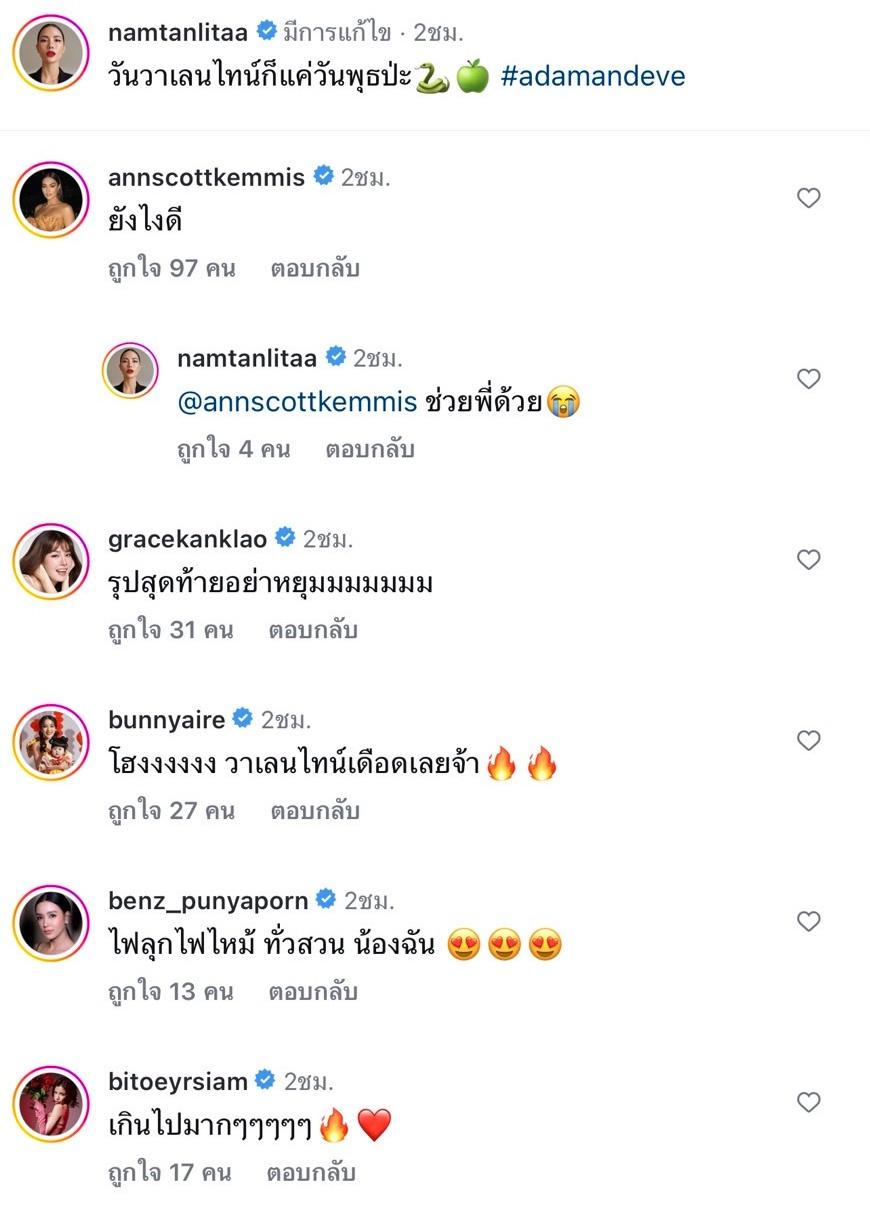 ท่ามกลางคอมเมนต์จากทั้งเพื่อนๆ แฟนๆ ที่พร้อมใจพูดกันว่าแซ่บจริงๆ อาทิ โฮงงงงงง วาเลนไทน์เดือดเลยจ้า, ไฟลุกไฟไหม้ ทั่วสวน น้องฉัน, เกินไปมากๆๆๆๆๆ, สวยมากกกกกกก, หูยยยย, ปังมากกก ฯลฯ แม้แต่ แบงค์ อนุสิทธิ ก็ยังเข้ามาคอมเมนต์ว่า “เขินอยู่นะ eve” ก่อนที่ น้ำตาล จะตอบกลับว่า “หยุดเขินข่ะ”.