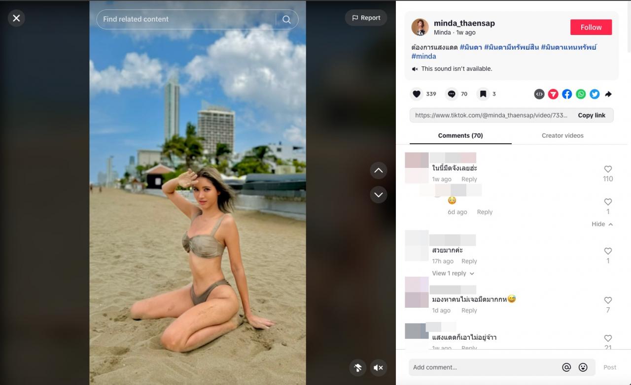 จะทำอะไรก็กลายเป็นประเด็นให้ชาวเน็ตได้แซะตลอด สำหรับ มินดา มีทรัพย์สิน ที่ล่าสุดโพสต์คลิปวิดีโอลงในแอป TikTok ซึ่งเป็นคลิปวิดีโอบรรยากาศตอนไปเที่ยวทะเล และเจ้าตัวนุ่งบิกินีสีเทาตัวจิ๋ว โพสท่าเพิ่มความเซ็กซี่ เขียนข้อความบรรยายว่า “ต้องการแสงแดด”