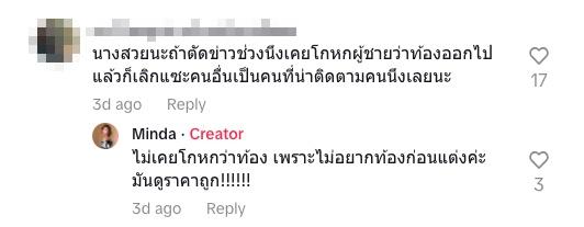 แต่แล้วก็มีชาวเน็ตรายหนึ่งที่เข้ามาคอมเมนต์วิจารณ์ว่า “นางสวยนะ ถ้าตัดข่าวช่วงนึงเคยโกหกผู้ชายว่าท้องออกไป แล้วก็เลิกแซะคนอื่น เป็นคนที่น่าติดตามคนนึงเลยนะ” งานนี้ มินดา ก็คอมเมนต์สวนกลับชาวเน็ตรายนี้ว่า “ไม่เคยโกหกว่าท้อง เพราะไม่อยากท้องก่อนแต่งค่ะ มันดูราคาถูก!!!!!!”