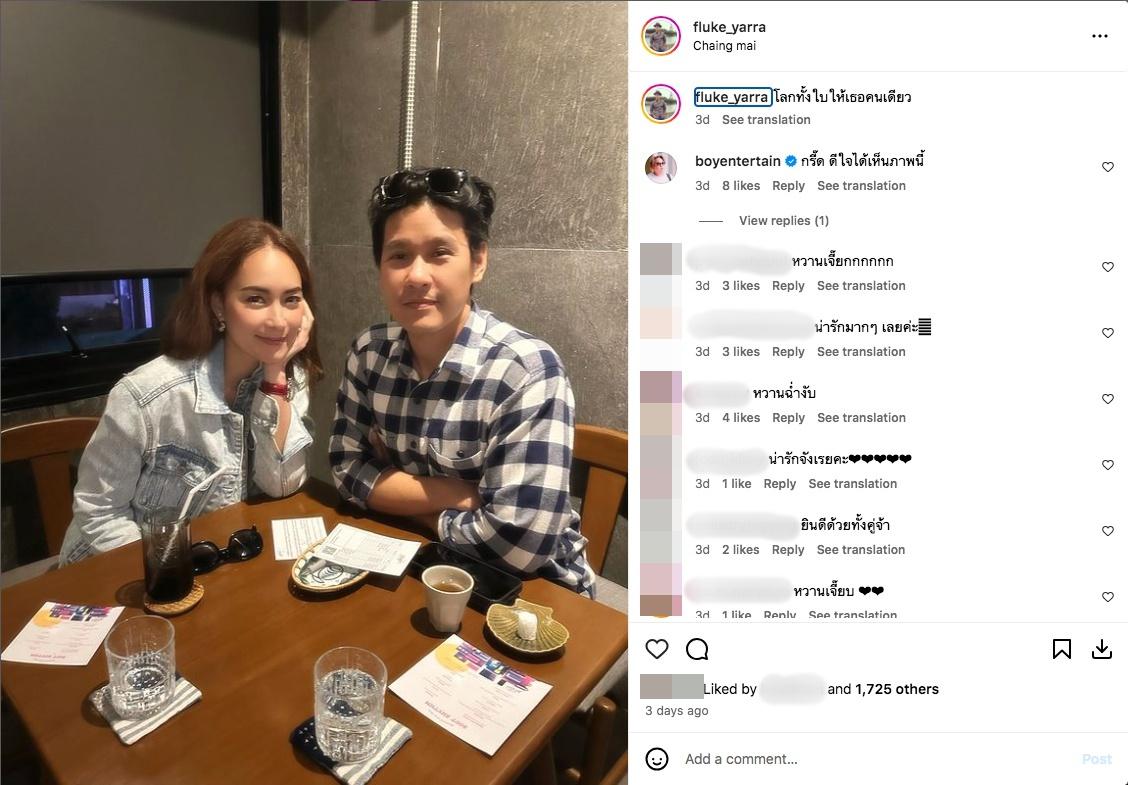 และในที่สุดไฮโซหนุ่ม ฟลุค ชลัคร ชีวเกษมสุข หรือ ไฮโซฟลุค นักธุรกิจหนุ่ม ก็จัดให้ตามคำขอ โพสต์ภาพคู่กับ บี น้ำทิพย์ ระหว่างไปทานอาหารด้วยกันลงในอินสตาแกรม @fluke_yarra ท่ามกลางบรรยากาศสุดโรแมนติก พร้อมทั้งเขียนแคปชั่นสุดหวานน้ำตาลเต็มไอจี “โลกทั้งใบให้เธอคนเดียว”