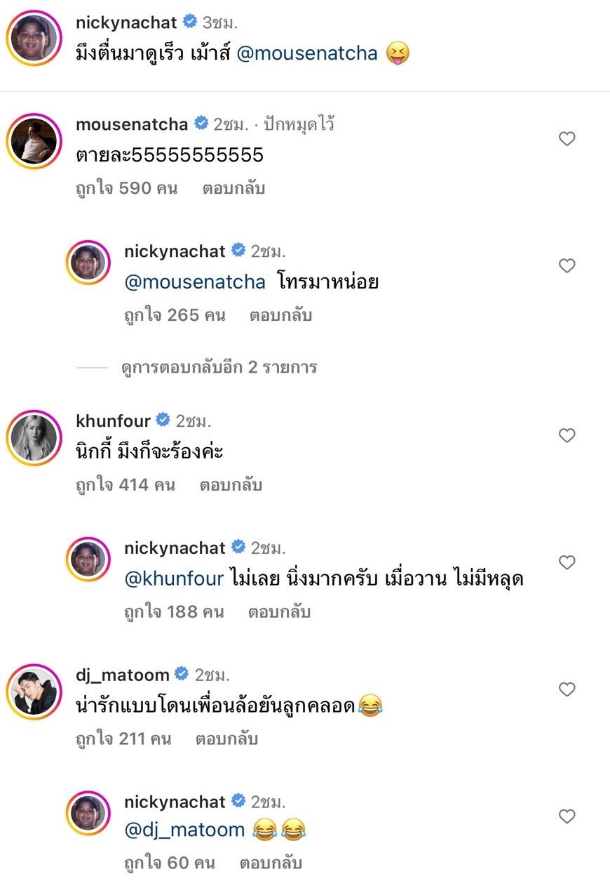 งานนี้ทำเอาคนในคลิปอย่าง เม้าส์ ถึงกับเขินหนัก ก่อนจะคอมเมนต์ตอบกลับว่า “ตายละ 55555555555” และ นิกกี้ ตอบไปว่า “โทรมาหน่อย” ด้าน โฟร์ ศกลรัตน์ เพื่อนซี้ของนิกกี้ ก็คอมเมนต์แซวว่า “นิกกี้ มึงก็จะร้องค่ะ” แต่งานนี้ นิกกี้ รีบตอบกลับว่า “ไม่เลย นิ่งมากครับ เมื่อวาน ไม่มีหลุด”.