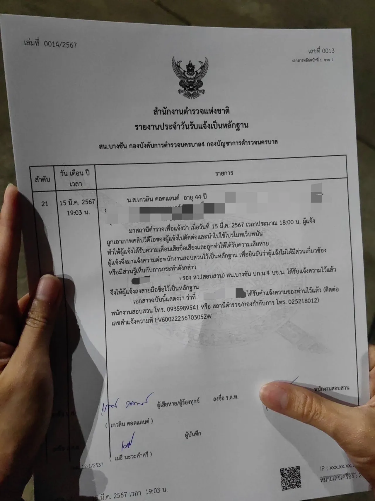 โดย สาวอ้อน เปิดเผยว่า เบื้องต้นแจ้งความไว้แล้ว เมื่อวันที่ 15 มี.ค. 2567 เวลาประมาณ 18.00 น. หลังทราบเรื่องถูกเอาภาพคลิปวิดีโอไปตัดต่อและนำไปใช้โปรโมตเว็บพนัน ทำให้ได้รับความเสื่อมเสียชื่อเสียงและถูกทำให้ได้รับความเสียหาย จึงมาแจ้งความต่อพนักงานสอบสวนไว้เป็นหลักฐาน เพื่อยืนยันว่าไม่ได้มีส่วนเกี่ยวข้อง หรือมีส่วนรู้เห็นกับการกระทำดังกล่าว ณ สน.บางชัน บก.น.4 บข.น. เพื่อปกป้องสิทธิ์และป้องกันความเข้าใจผิดจากภัยของสังคม.
