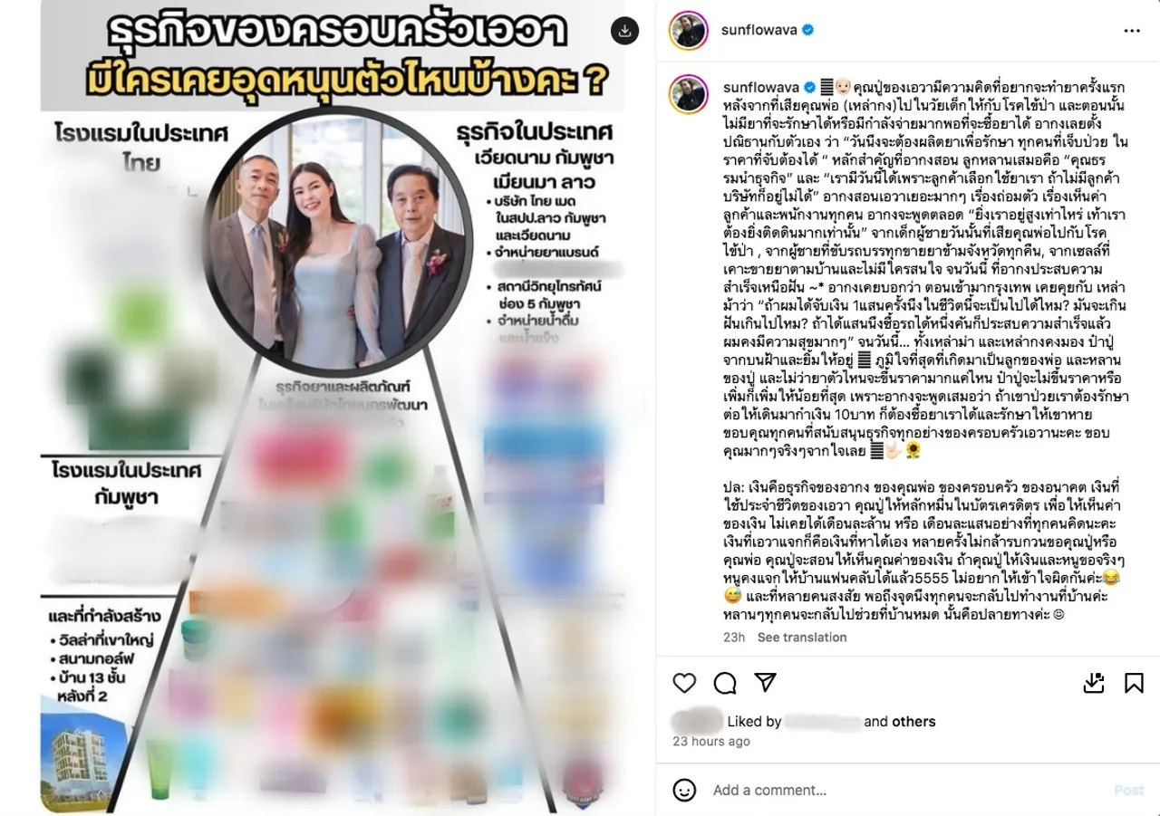 ล่าสุด เอวา ปวรวรรณ ก็ได้โพสต์ภาพรวมธุรกิจของครอบครัว ซึ่งมีทั้งธุรกิจยา น้ำดื่ม น้ำแข็ง โรงแรม สถานีวิทยุโทรทัศน์ในกัมพูชา รวมไปถึงมูลนิธิ สโมสรฟุตบอลที่กัมพูชา และสิ่งที่กำลังจะสร้าง คือ วิลล่าที่เขาใหญ่ สนามกอล์ฟ บ้าน 13 ชั้นหลังที่ 2