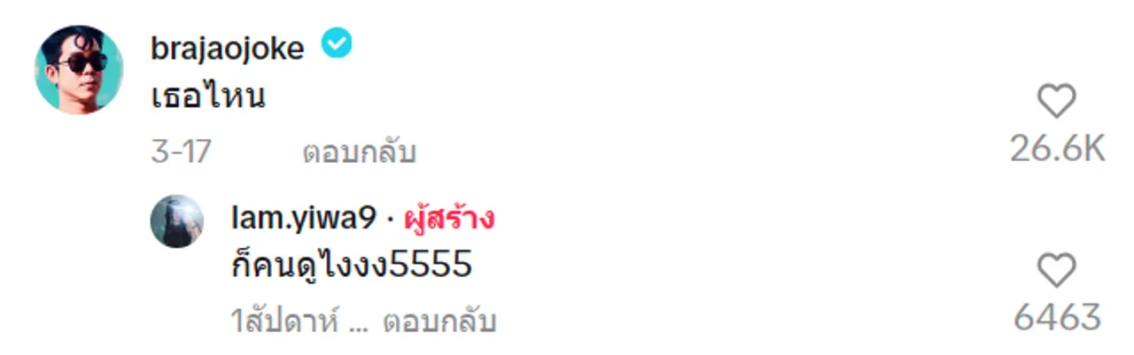 ล่าสุด น้องยี่หวา เล่นคอนเทนต์ดังใน TikTok โพสต์ภาพของตัวเอง พร้อมเขียนแคปชั่นว่า "ส่งให้เธอ" ทำเอา พ่อโจ๊ก ถึงกับคิ้วกระตุก คอมเมนต์ถามว่า "เธอไหน" ด้าน น้องยี่หวา ไม่รอช้า รีบตอบกลับว่า "ก็คนดูไงงง 5555"