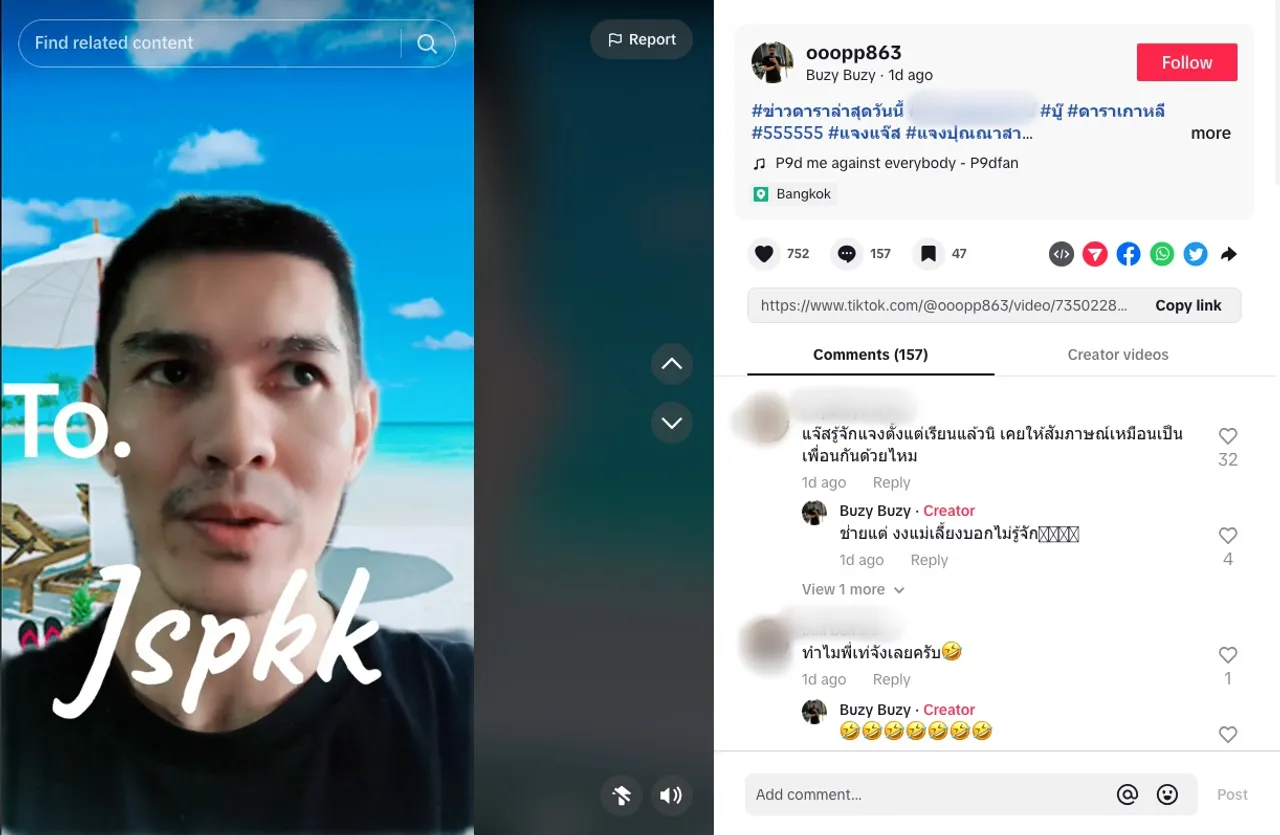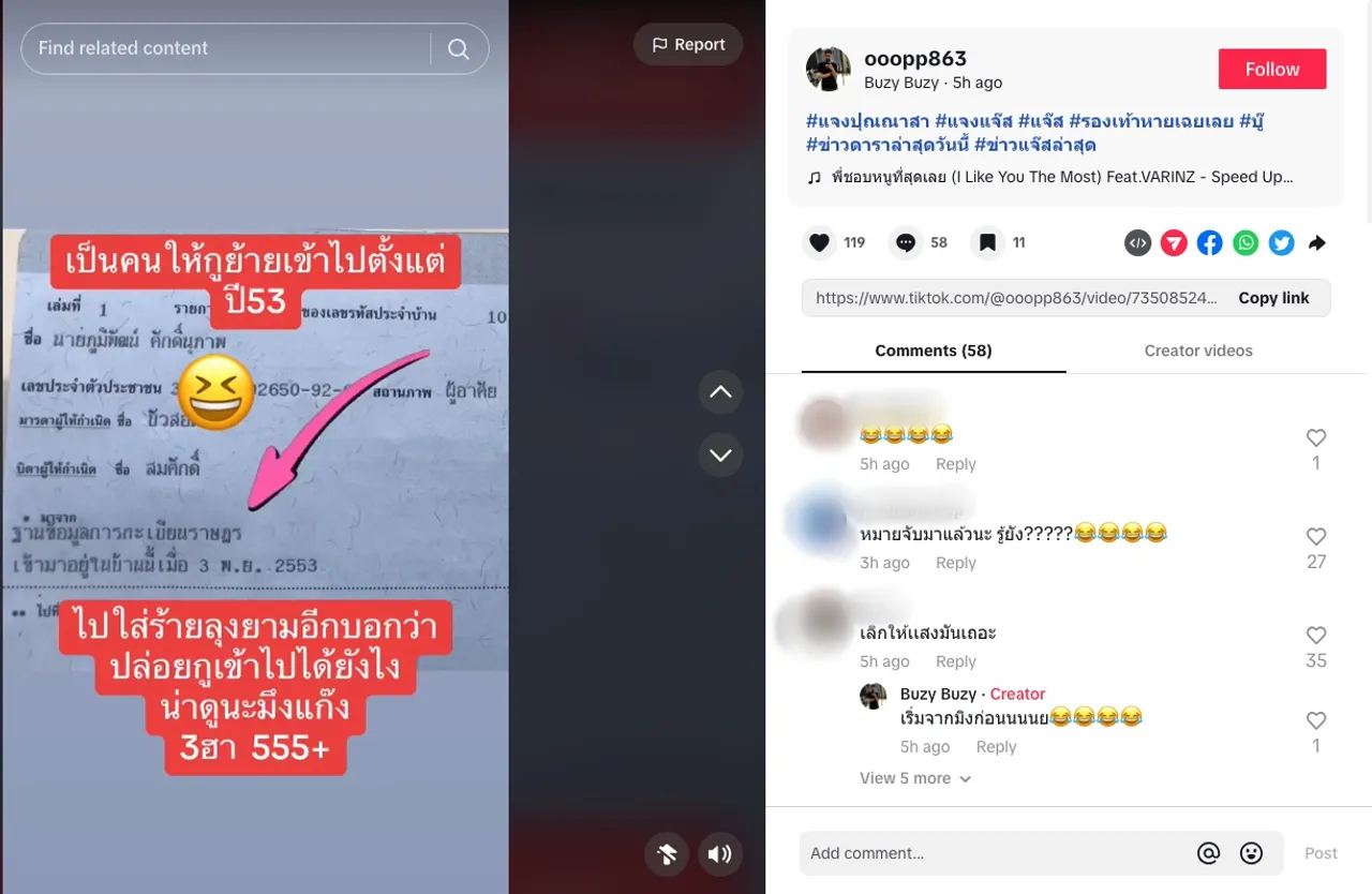 ในขณะที่ บู๊ น้องชายแจง ยังคงเคลื่อนไหวผ่านโซเชียล โพสต์ภาพทะเบียนบ้านลงใน TikTok พร้อมทั้งเขียนข้อความว่า “เป็นคนให้กูย้ายเข้าไปตั้งแต่ปี 53 ไปใส่ร้ายลุงยามอีก บอกว่าปล่อยกูเข้าไปได้ยังไง น่าดูนะมึงแก๊ง 3 ฮา 555+”