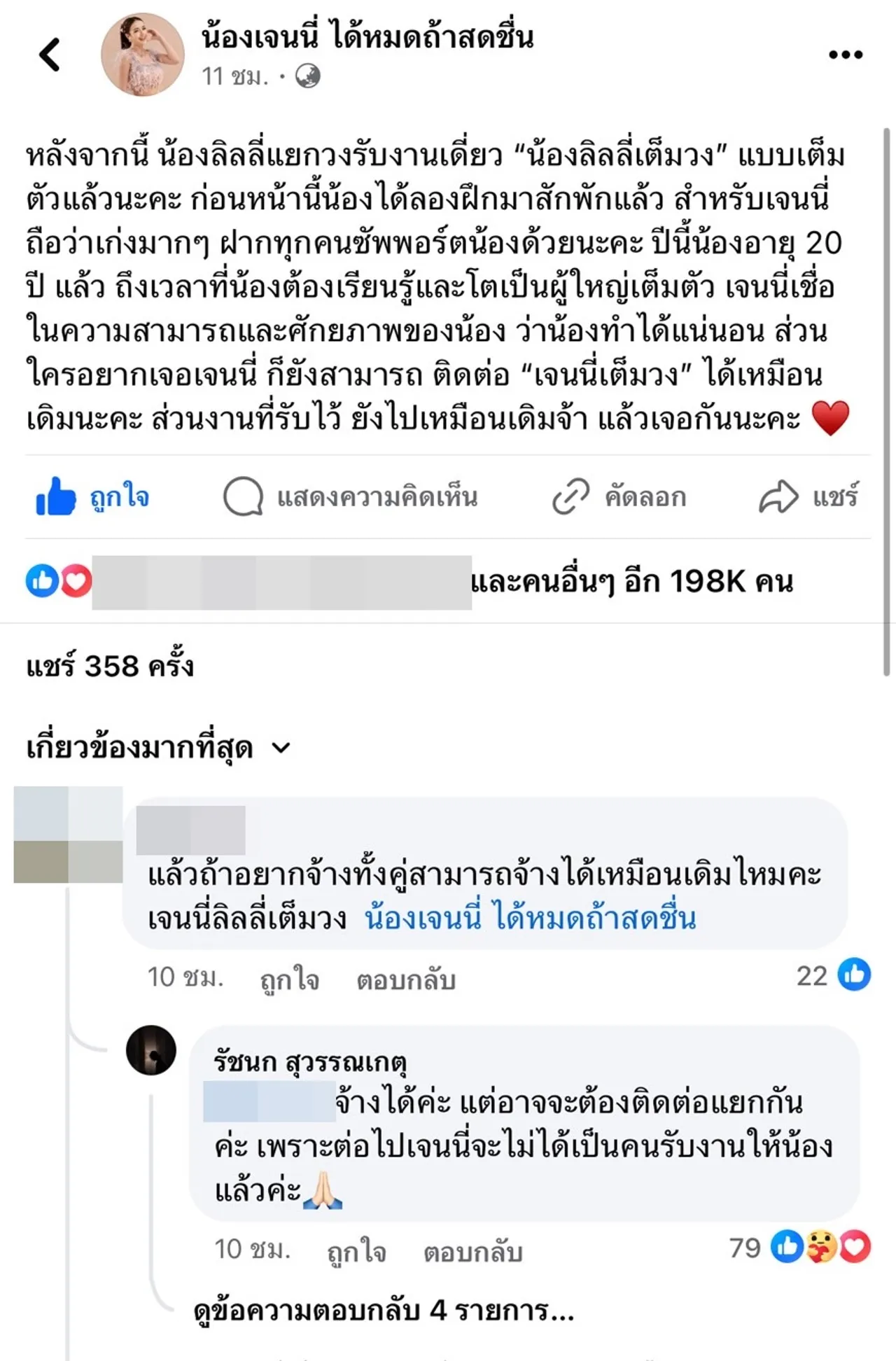 โดยมีแฟนๆ ที่ต่างเข้ามาให้กำลังใจมากมาย และเมื่อมีแฟนเพลงเข้ามาถามว่า “แล้วถ้าอยากจ้างทั้งคู่สามารถจ้างได้เหมือนเดิมไหมคะ เจนนี่ลิลลี่เต็มวง” ซึ่ง เจนนี่ ก็ได้ตอบกลับว่า “จ้างได้ค่ะ แต่อาจจะต้องติดต่อแยกกันค่ะ เพราะต่อไปเจนนี่จะไม่ได้เป็นคนรับงานให้น้องแล้วค่ะ”.