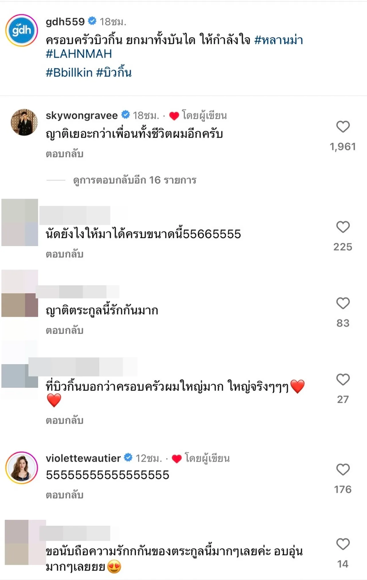 นอกจากนี้ในอินสตาแกรมค่ายจีดีเอช @gdh559 ก็ได้โพสต์ภาพบรรยากาศ พร้อมทั้งเขียนข้อความว่า “ครอบครัวบิวกิ้น ยกมาทั้งบันได ให้กำลังใจ #หลานม่า #LAHNMAH #Bbillkin #บิวกิ้น” งานนี้ทำเอานักแสดงหนุ่มหน้าใส สกาย วงศ์รวี ถึงกับคอมเมนต์ว่า “ญาติเยอะกว่าเพื่อนทั้งชีวิตผมอีกครับ” ทำเอาแฟนๆ แห่กดไลค์และแสดงความคิดเห็นใต้โพสต์หลายข้อความเลยทีเดียว.