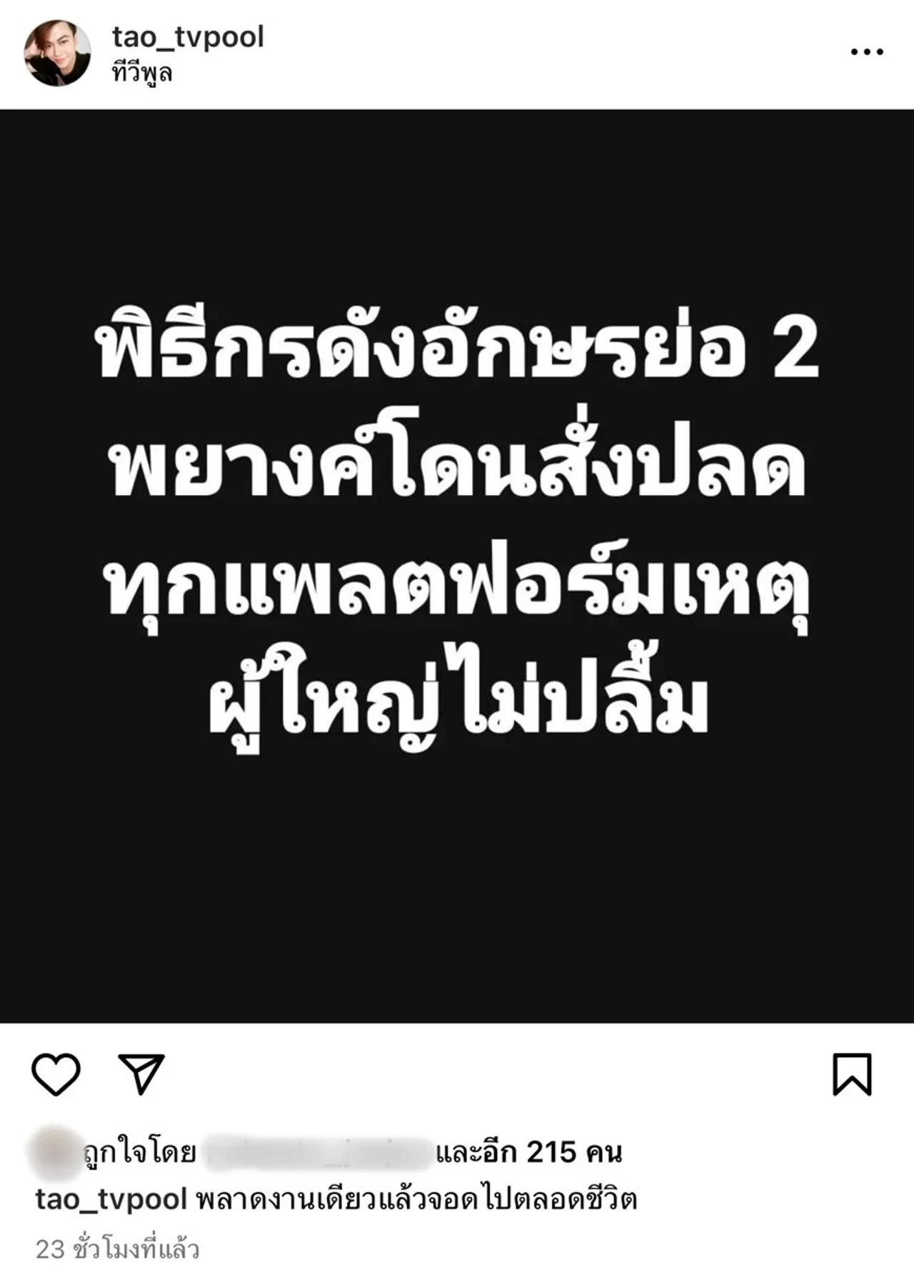 โดยในอินสตาแกรม @tao_tvpool ได้โพสต์ภาพข้อความเขียนว่า “พิธีกรดังอักษรย่อ 2 พยางค์โดนสั่งปลดทุกแพลตฟอร์มเหตุผู้ใหญ่ไม่ปลื้ม” พร้อมทั้งเขียนแคปชั่น “พลาดงานเดียวแล้วจอดไปตลอดชีวิต”