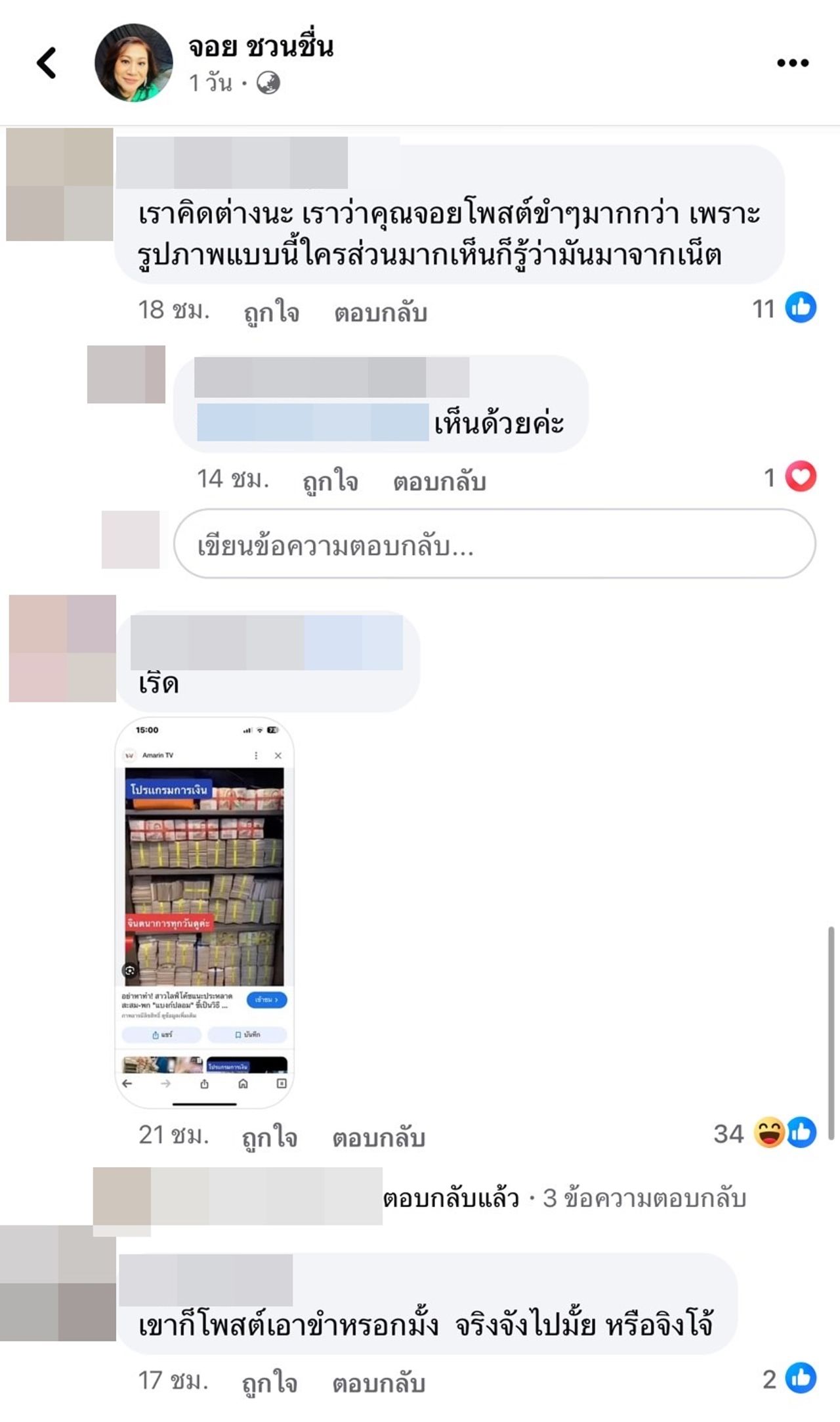 นอกจากนี้ก็มีแฟนๆ เข้ามาแสดงความคิดเห็นเพิ่มเติม อาทิ เห็นด้วยครับ จอยก็แค่ทำ content ขำๆ ไม่ได้เป็นพิษเป็นภัยใคร จะมาดราม่ากันทำไม!!, เราคนนึงเห็นคนลงเยอะในเฟซ พอมาเห็นทางนี้เลยเฉยๆ มันไม่ใช่เคสแรก บางคนส่งแทบทุกวัน ในตอนเช้าๆ สวัสดีพร้อมภาพเหล่านี้, คือถ้ามันมีประโยคว่า นี่เงินของเรา จำนวน.... อะไรว่าไป แบบไม่ลอยๆ แบบนี้อันนั้นค่อยน่าตำหนิเหมือนหลอกลวง นี่เหมือนคนจ้องติจ้องว่า ลูกอิช่างติเยอะค่ะในนี้ บางอย่างถ้าไม่ได้เดือดร้อนใครแบบผิดกฎหมาย เราว่า ปล่อยเขาไปบ้างเถอะเนอะ ฯลฯ