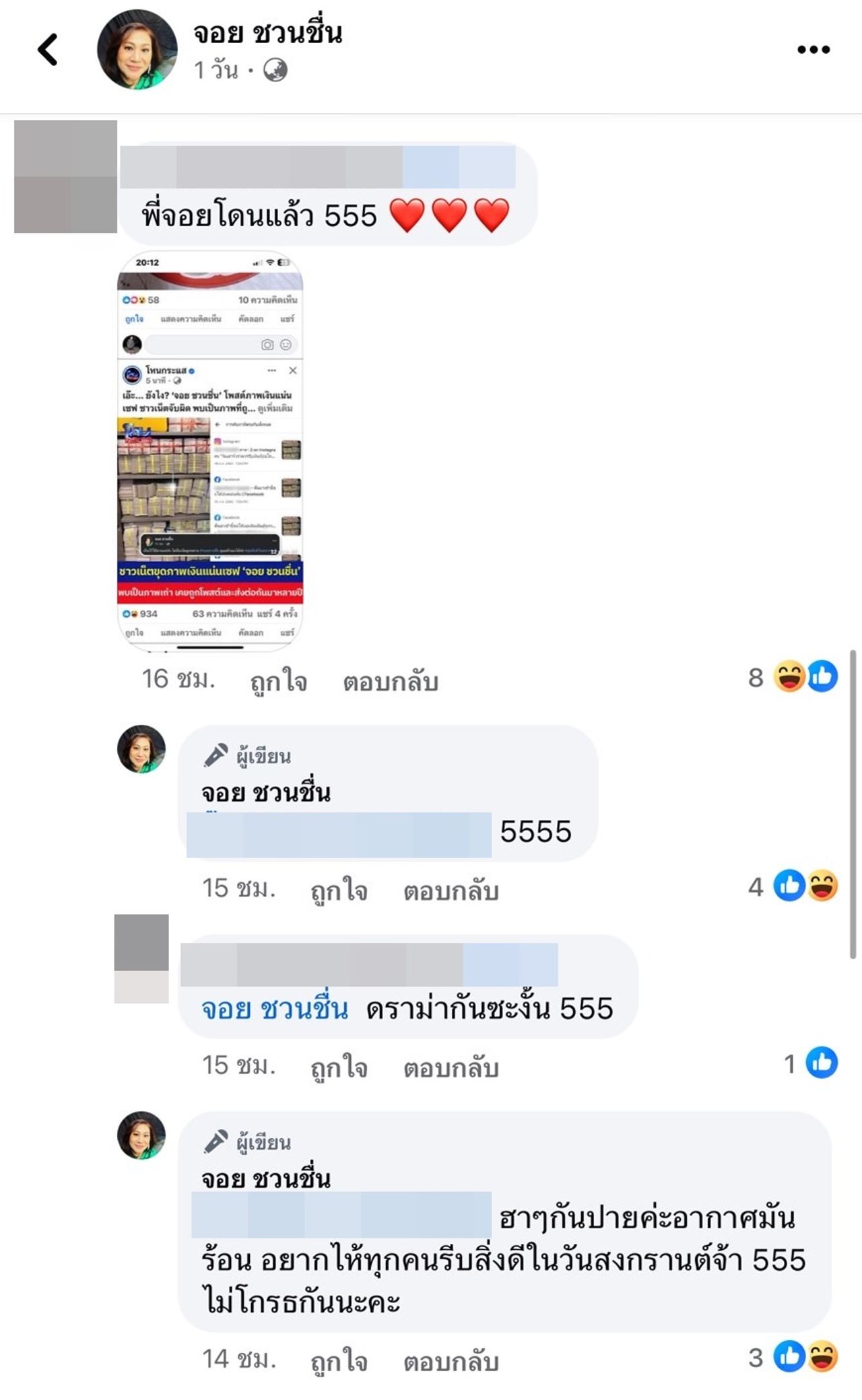 ล่าสุด จอย ชวนชื่น ก็ได้ตอบคอมเมนต์ที่บอกว่า “พี่จอยโดนแล้ว 555” โดยบอกว่า “ฮาๆ กันปายค่ะอากาศมันร้อน อยากไห้ทุกคนรีบสิ่งดีในวันสงกรานต์จ้า 555 ไม่โกรธกันนะคะ”