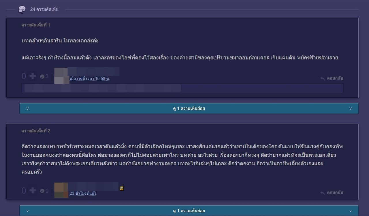 ท่ามกลางคอมเมนต์จากชาวเน็ตในพันทิปที่แสดงความคิดเห็น อาทิ บทคล้ายๆ อิน สาริน ในทองเอกอ่ะค่ะ แต่เอาจริงๆ ถ้าเรื่องนี้ออนแล้วดัง เอาละครของไอซ์ที่ดองไว้สองเรื่อง ของค่ายสามีของคุณปรียานุชมาออนก่อนเถอะ เก็บแผ่นดิน พยัคฆ์ร้ายซ่อนลาย, น้องไอซ์ก็เล่นละครดีนะคะ อ้ายข่อยฮักเจ้า พระเอกร่วมกับกระทิง กลเกมรัก พระเอกร่วมกับอู๋ ในเรื่องนี้ปะทะเจมส์จิ บทน่าจะดีนะ ทุกคนมีจังหวะของตัวเอง ก็อยากให้ดังๆ แต่เป็นบทเรียนในการดันของช่อง ค่อยๆ ดัน คนจะได้ไม่หมั่นไส้เด็ก, รอดูหน้างานดีกว่า ดูอย่างริว บทรองเจมส์จิในมาตาลดา ยังเปรี้ยงเลย,