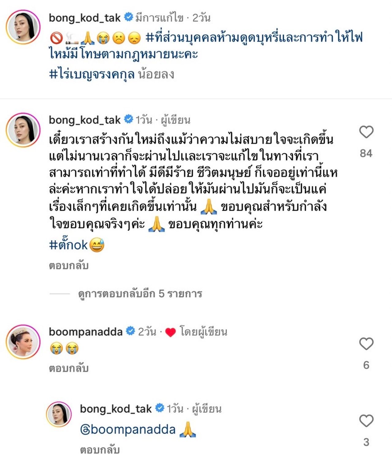 ก่อนจะเขียนข้อความเพิ่มเติมในคอมเมนต์ว่า “เดี๋ยวเราสร้างกันใหม่ ถึงแม้ว่าความไม่สบายใจจะเกิดขึ้น แต่ไม่นานเวลาก็จะผ่านไป และเราจะแก้ไขในทางที่เราสามารถเท่าที่ทำได้ มีดีมีร้าย ชีวิตมนุษย์ ก็เจออยู่เท่านี้แหละค่ะ หากเราทำใจได้ ปล่อยให้มันผ่านไป มันก็จะเป็นแค่เรื่องเล็กๆ ที่เคยเกิดขึ้นเท่านั้น ขอบคุณสำหรับกำลังใจ ขอบคุณจริงๆ ค่ะ ขอบคุณทุกท่านค่ะ #ตั๊กok”
