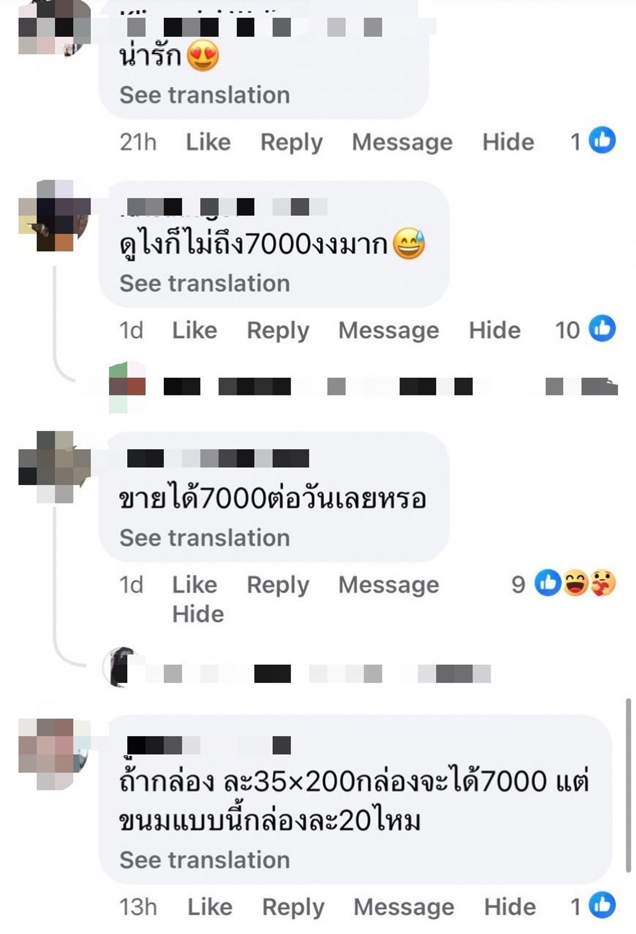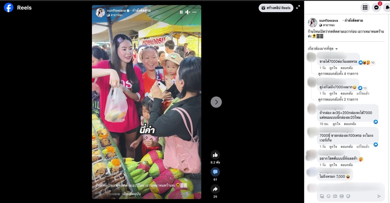 อาทิ ดูไงก็ไม่ถึง 7000 งงมาก, ขายได้ 7000 ต่อวันเลยหรอ, ถ้ากล่องละ 35x200 กล่องจะได้ 7000 แต่ขนมแบบนี้กล่องละ 20 ไหม, เห็นใจดีก็ควรเกรงใจ เกินไป 7000, จะถึง 7 พันหรือเปล่าไม่รู้ แต่ที่รู้ๆ คือคุณหนูเอวาใจดีมากค่ะ, 7000. นี่ ขายกล่องละ 100 เหรอ งงในงงเวอร์เกิ๊น, ขนมอะไรนิ 7000 บาท ฯลฯ