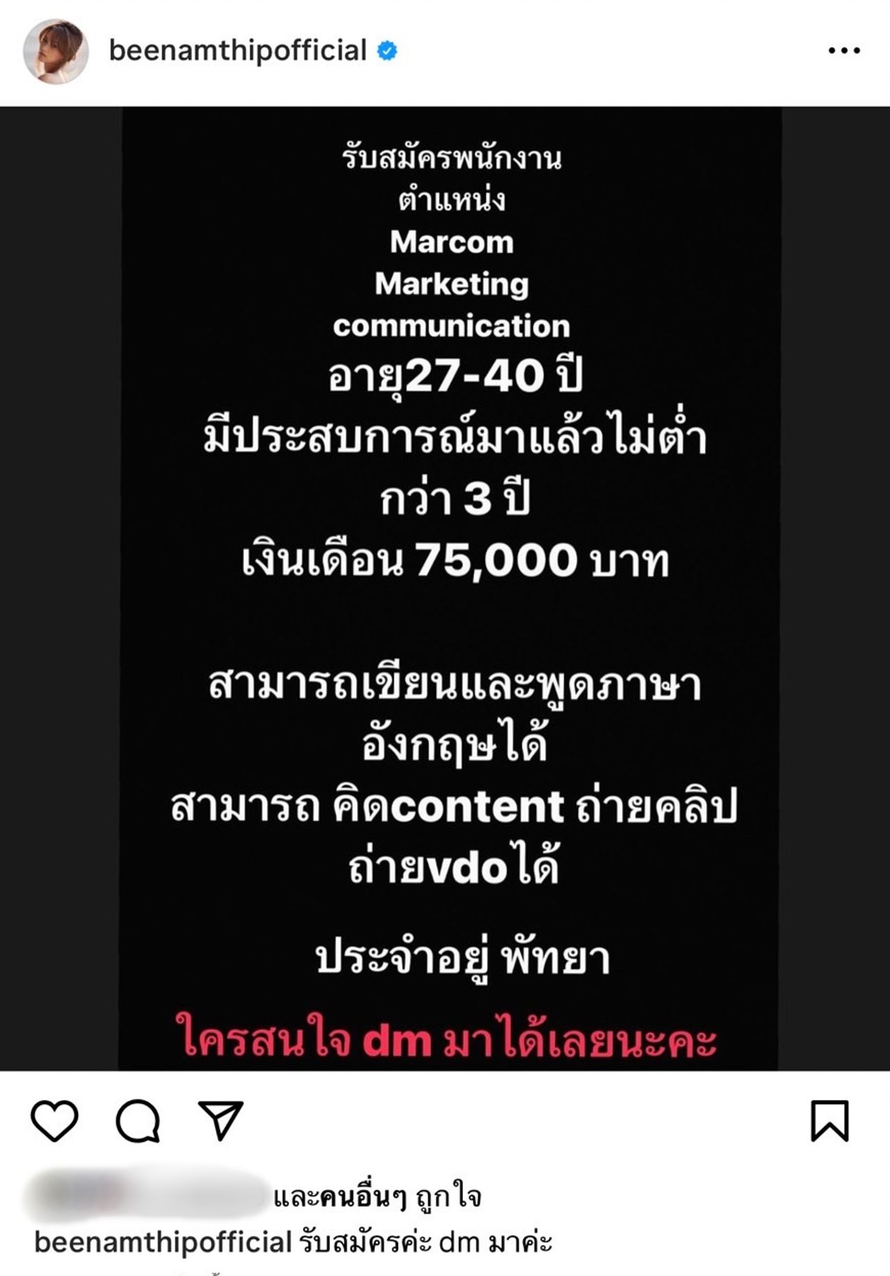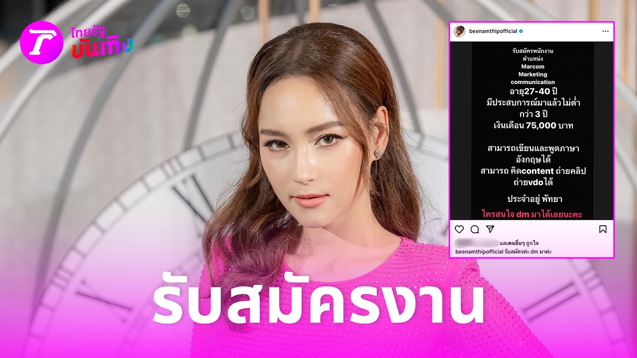 ซึ่งในอินสตาแกรม @beenamthipofficial ได้โพสต์ภาพข้อความที่เขียนว่า “รับสมัครพนักงาน ตําแหน่ง Marcom Marketing Communication อายุ 27-40 ปี มีประสบการณ์มาแล้วไม่ต่ำกว่า 3 ปี เงินเดือน 75,000 บาท สามารถเขียนและพูดภาษาอังกฤษได้ สามารถคิด Content ถ่ายคลิป VDO ได้ ประจำอยู่พัทยา ใครสนใจ DM มาได้เลยนะคะ”