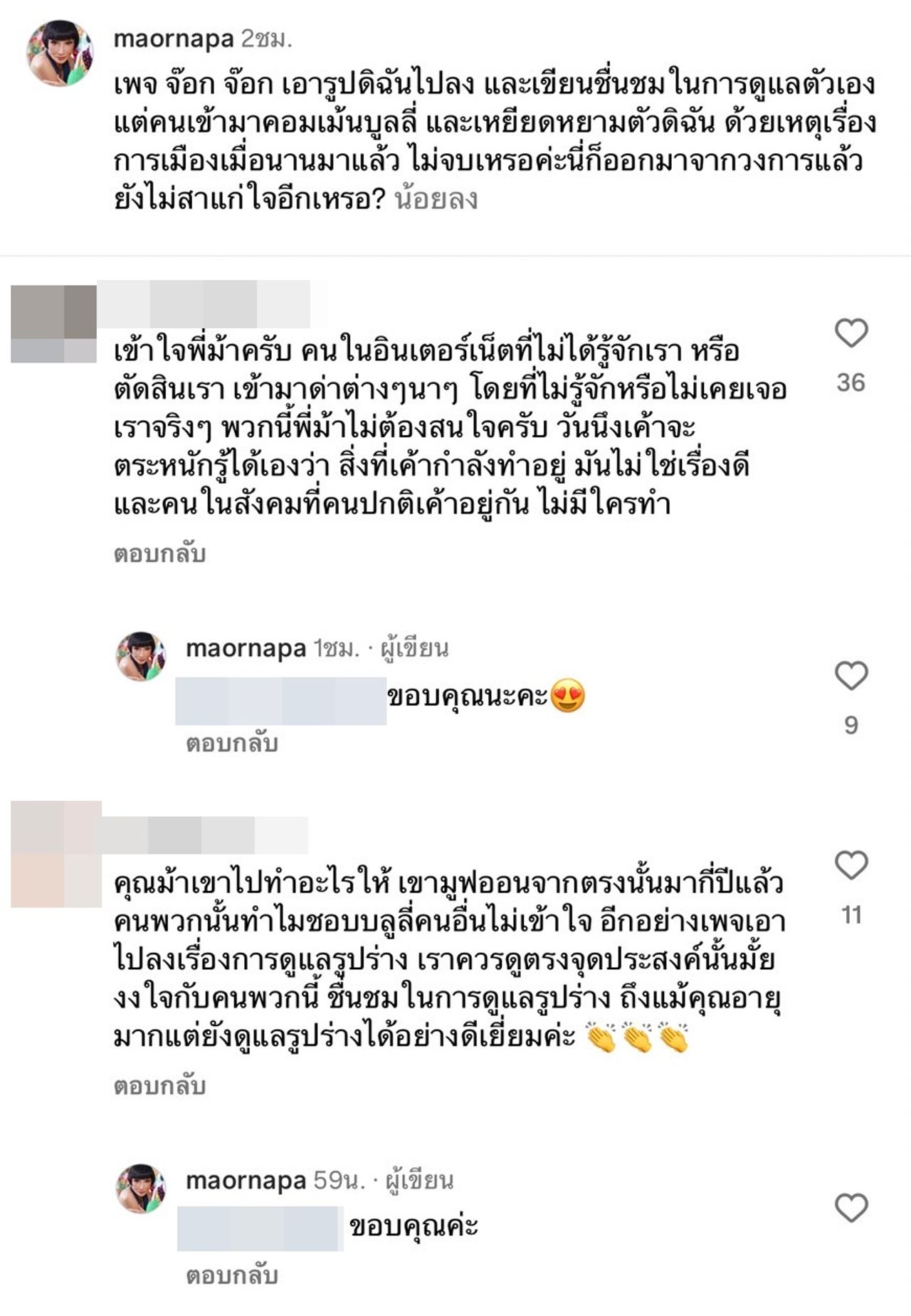 คุณม้าเขาไปทำอะไรให้ เขามูฟออนจากตรงนั้นมากี่ปีแล้ว คนพวกนั้นทำไมชอบบูลลี่คนอื่นไม่เข้าใจ อีกอย่างเพจเอาไปลงเรื่องการดูแลรูปร่าง เราควรดูตรงจุดประสงค์นั้นมั้ย งงใจกับคนพวกนี้ ชื่นชมในการดูแลรูปร่าง ถึงแม้คุณอายุมากแต่ยังดูแลรูปร่างได้อย่างดีเยี่ยมค่ะ, ไม่ต้องสนใจกลุ่มคนพวกนี้ค่ะ สมองมันคิดได้แค่นั้นค่ะ, คนพวกนี้เค้าคิดไม่เป็น หรือก็ไม่มีมารยาท ประมาณนั้นค่ะ น่าสงสารเค้านะคะ ฯลฯ