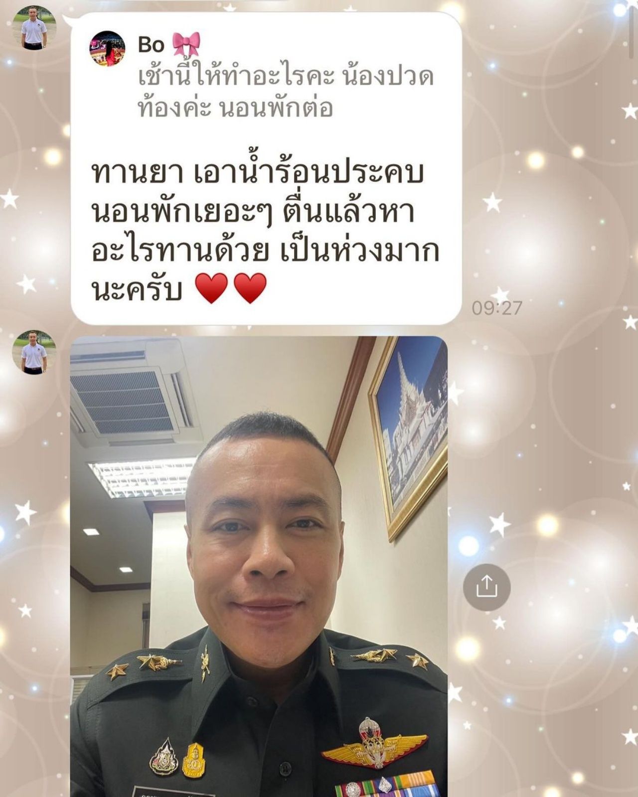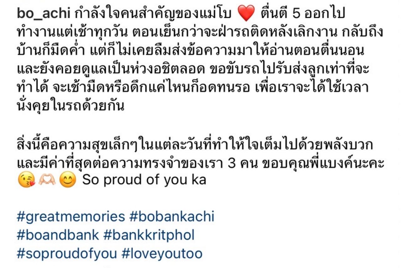 "กำลังใจคนสำคัญของแม่โบ ตื่นตี 5 ออกไปทำงานแต่เช้าทุกวัน ตอนเย็นกว่าจะฝ่ารถติดหลังเลิกงาน กลับถึงบ้านก็มืดค่ำ แต่ก็ไม่เคยลืมส่งข้อความมาให้อ่านตอนตื่นนอน และยังคอยดูแลเป็นห่วงอชิตลอด ขอขับรถไปรับส่งลูกเท่าที่จะทำได้ จะเช้ามืดหรือดึกแค่ไหนก็อดทนรอ เพื่อเราจะได้ใช้เวลานั่งคุยในรถด้วยกัน