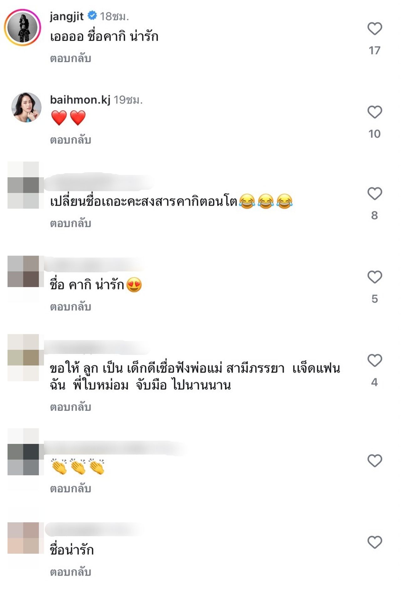 งานนี้ แจง ปุณณาสา ภรรยา แจ๊ส ชวนชื่น คอมเมนต์ว่า “เออออ ชื่อคากิ น่ารัก" ในขณะที่แฟนๆ แห่คอมเมนต์แซวกันยกใหญ่ บ้างก็บอกน่ารัก ชื่อน่ากิน แต่บางคนบอกอยากให้เปลี่ยนชื่อ สงสารคากิตอนโต ฯลฯ