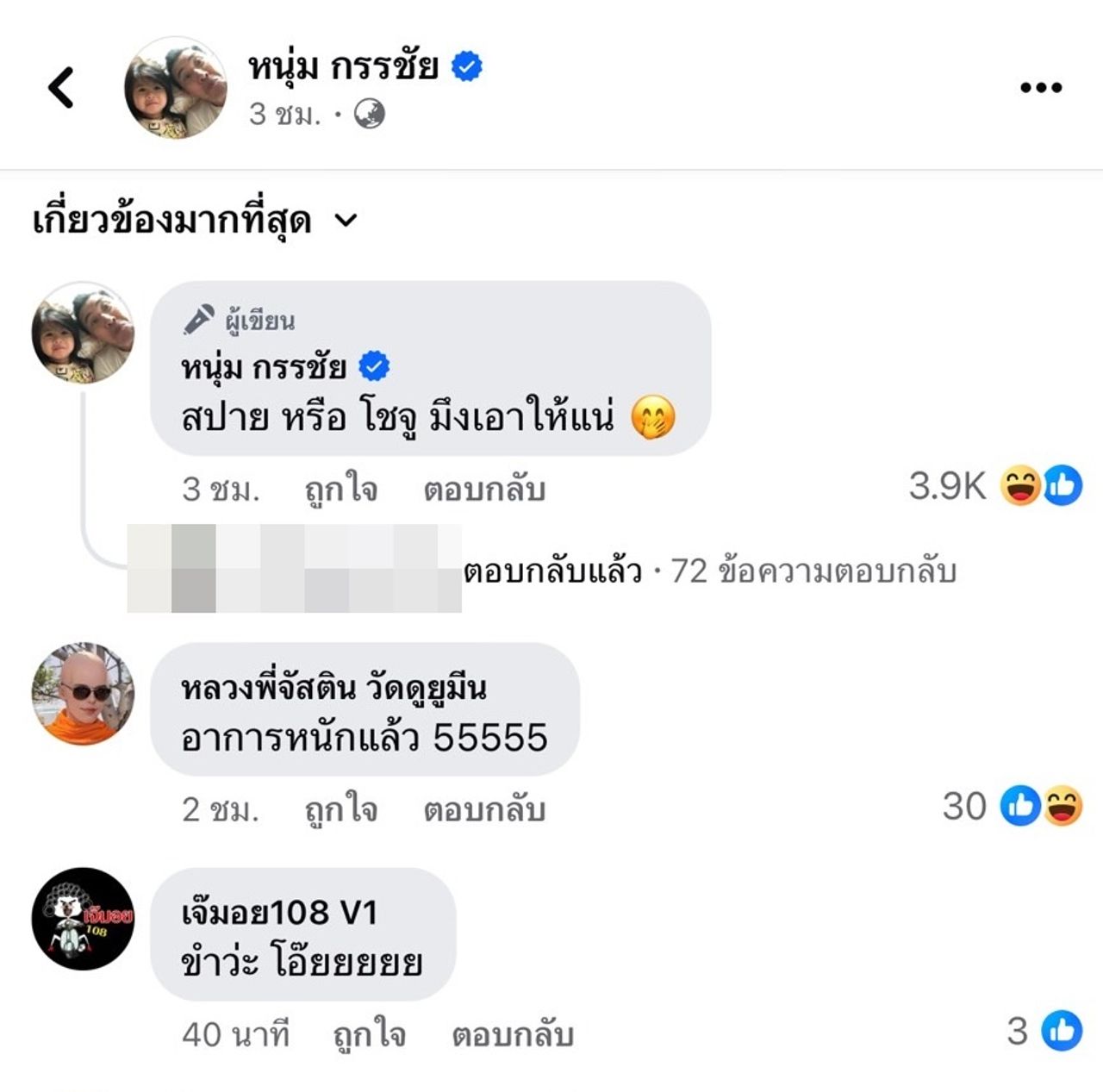 แต่งานนี้ หนุ่ม กรรชัย กำเนิดพลอย พิธีกรชื่อดัง ซึ่งเป็นหนึ่งในผู้ที่ติดตามเรื่องนี้และนำเสนอข่าวประเด็นดังกล่าว โพสต์โต้กลับประเด็นดังกล่าวแบบจี๊ดใจสุดๆ โดยบอกว่า “ด้วยความเคารพครับแอด เชื่อมจิตได้ทำไมไม่เชื่อมดูครับ เสืxกส่งสปายไปทำไมครับ” พร้อมทั้งใส่อีโมจิเอามือปิดปาก ก่อนจะโพสต์คอมเมนต์เพิ่มเติมว่า “สปาย หรือ โชจู มึงเอาให้แน่”