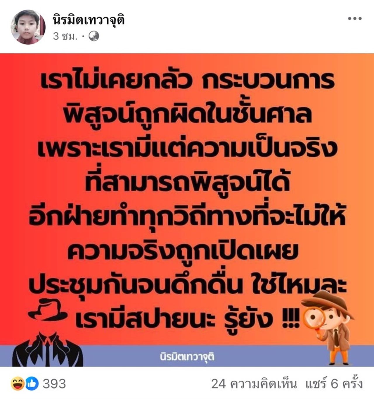 ล่าสุด เพจนิรมิตเทวาจุติ ก็ได้โพสต์ภาพข้อความหลังทราบว่ามีการแจ้งความดำเนินคดี โดยบอกว่า “เราไม่เคยกลัว กระบวนการพิสูจน์ในชั้นศาล เพราะเรามีแต่ความจริงที่สามารถพิสูจน์ได้ อีกฝ่ายทำทุกวิถีทางที่จะไม่ให้ความจริงถูกเปิดเผย ประชุมกันจนดึกดื่นใช่ไหมละ เรามีสปายนะ รู้ยัง”