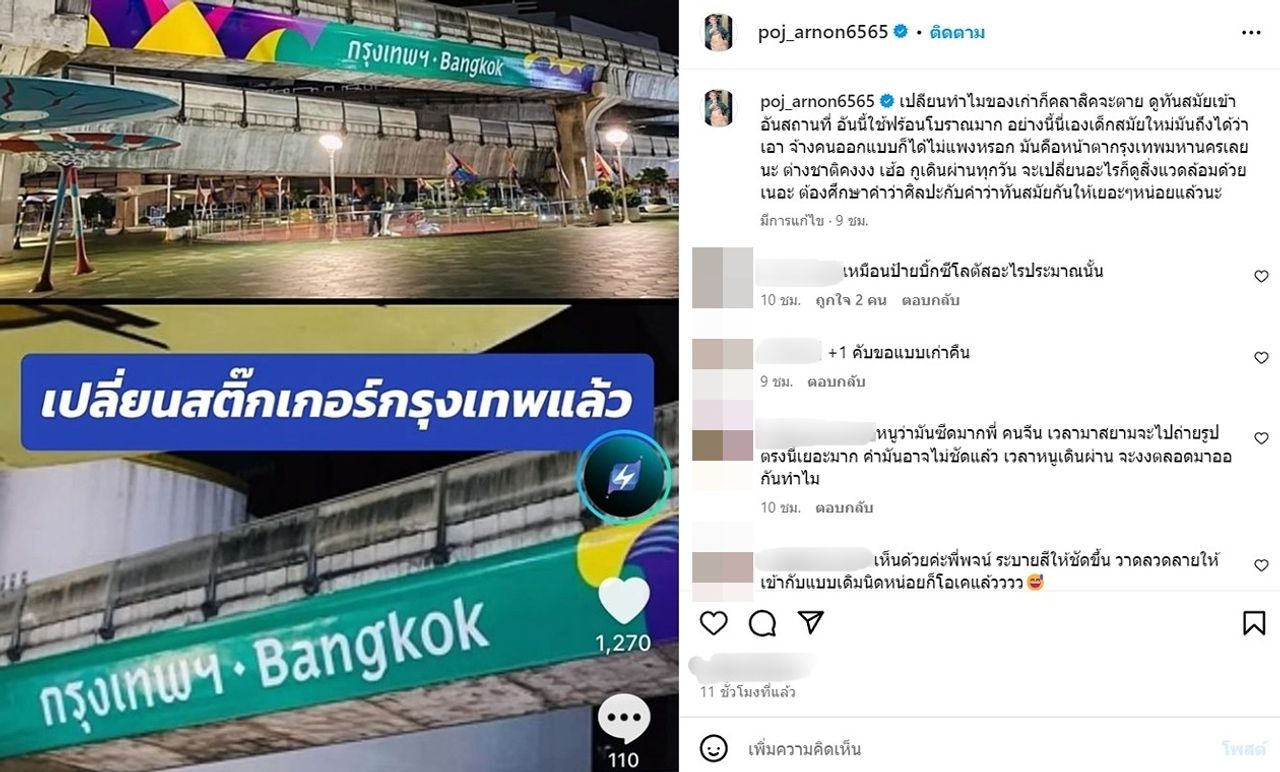 ล่าสุด พชร์ อานนท์ ผู้กำกับภาพยนตร์-พิธีกรชื่อดัง ได้แสดงความคิดเห็นถึงเรื่องนี้ผ่านทางอินสตาแกรม @poj_arnon6565 ว่าเปลี่ยนทำไม ป้ายใหม่ฟอนต์โบราณมาก โดยโพสต์ภาพป้าย BANGKOK อันใหม่ พร้อมทั้งเขียนข้อความว่า “เปลี่ยนทำไม ของเก่าก็คลาสสิกจะตาย ดูทันสมัยเข้ากับสถานที่ อันนี้ใช้ฟอนต์โบราณมาก