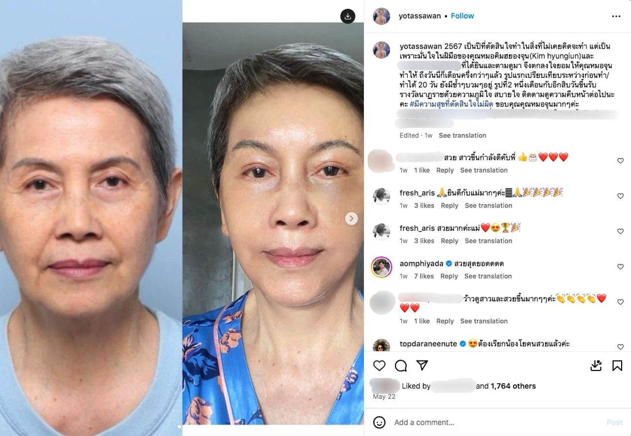 ซึ่ง โย ทัศน์วรรณ ได้โพสต์ภาพให้เห็นความแตกต่างทั้งก่อนและหลังทำศัลยกรรม พร้อมทั้งเขียนข้อความว่า “2567 เป็นปีที่ตัดสินใจทำในสิ่งที่ไม่เคยคิดจะทำ แต่เป็นเพราะมั่นใจในฝีมือของคุณหมอคิมฮยองจุน (Kim hyungiun) และ...ที่ได้ยินและตามดูมา จึงตกลงใจยอมให้คุณหมอจุนทำให้ ถึงวันนี้ก็เดือนครึ่งกว่าๆ แล้ว