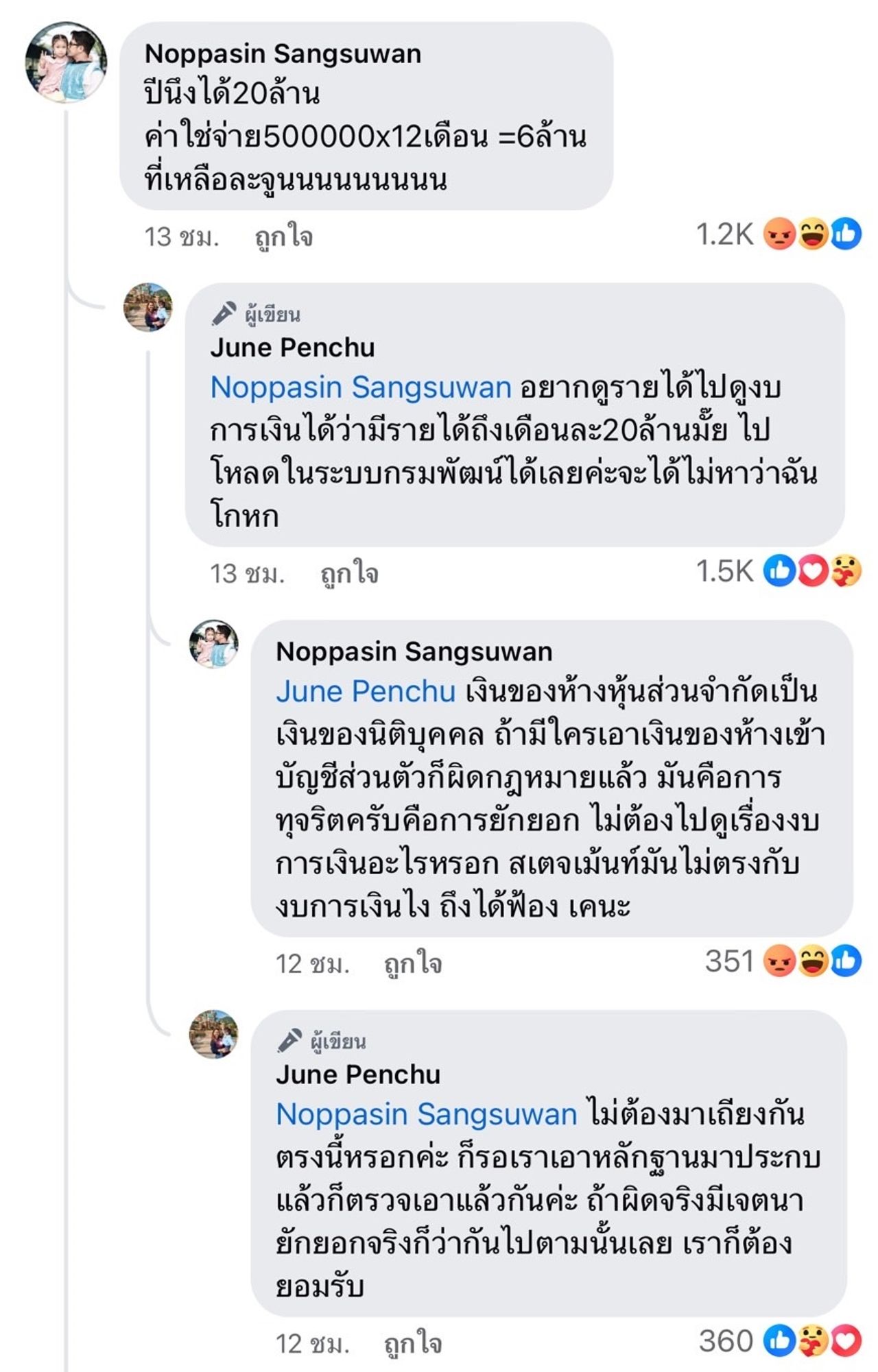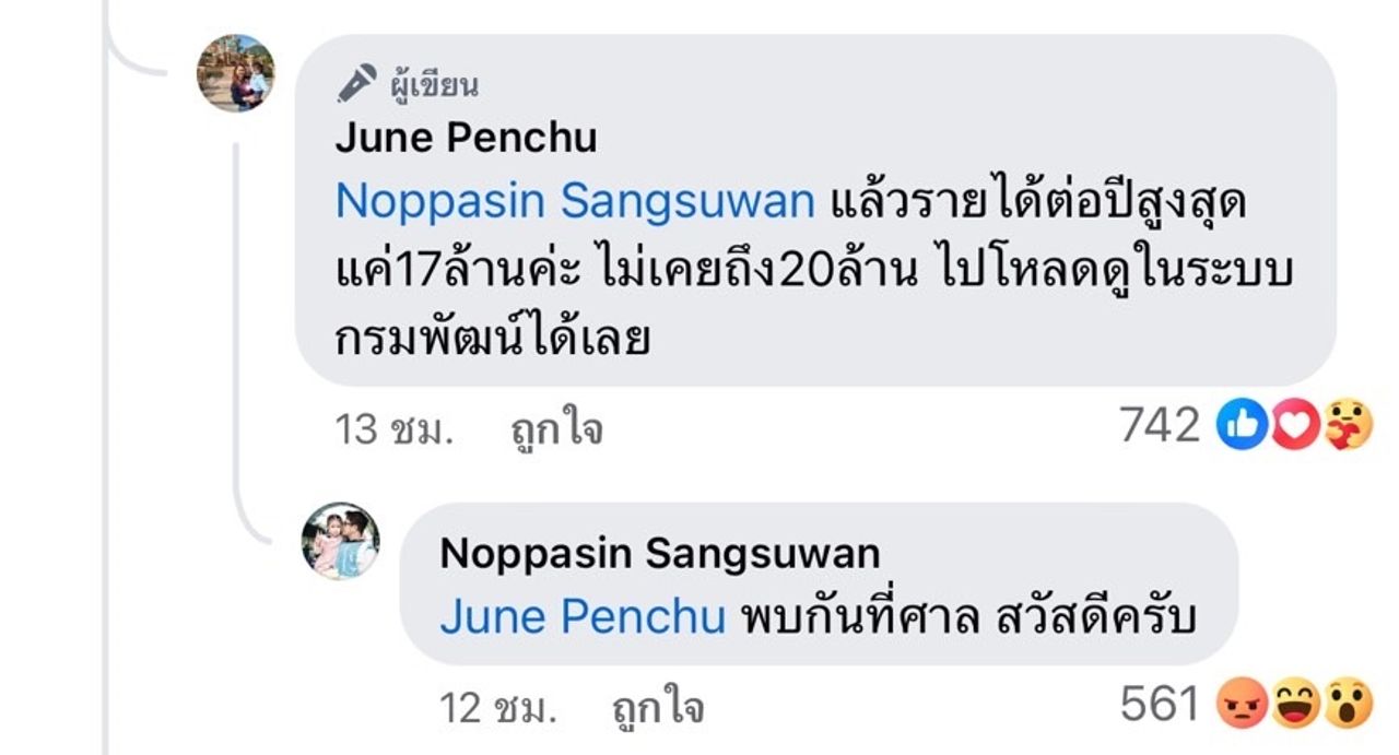 จากนั้น จูน คอมเมนต์ถึง หนุ่ม ว่า “ไม่ต้องมาเถียงกันตรงนี้หรอกค่ะ ก็รอเราเอาหลักฐานมาประกบแล้วก็ตรวจเอาแล้วกันค่ะ ถ้าผิดจริงมีเจตนายักยอกจริงก็ว่ากันไปตามนั้นเลย เราก็ต้องยอมรับ” และ “แล้วรายได้ต่อปีสูงสุดแค่ 17 ล้านค่ะ ไม่เคยถึง 20 ล้าน ไปโหลดดูในระบบกรมพัฒน์ได้เลย” สุดท้าย หนุ่ม ก็ตัดจบการพูดคุย โดยบอกว่า “พบกันที่ศาล สวัสดีครับ”.