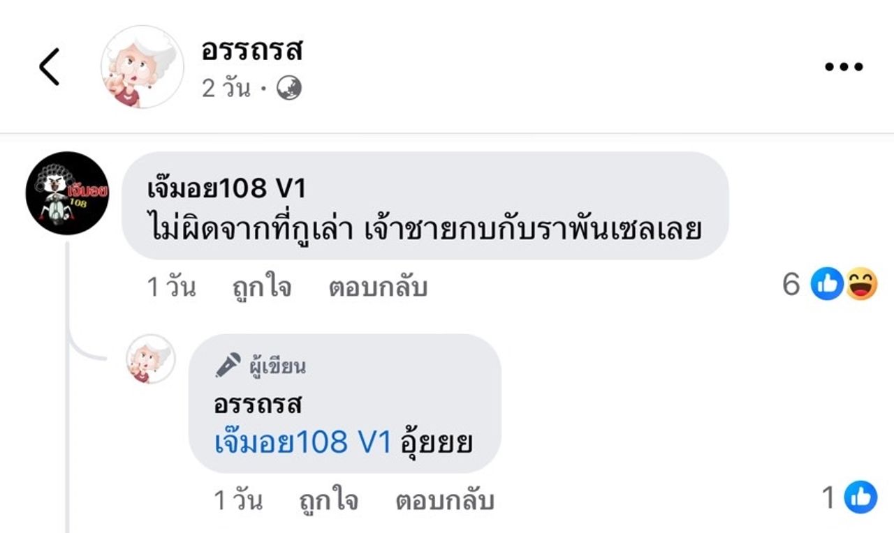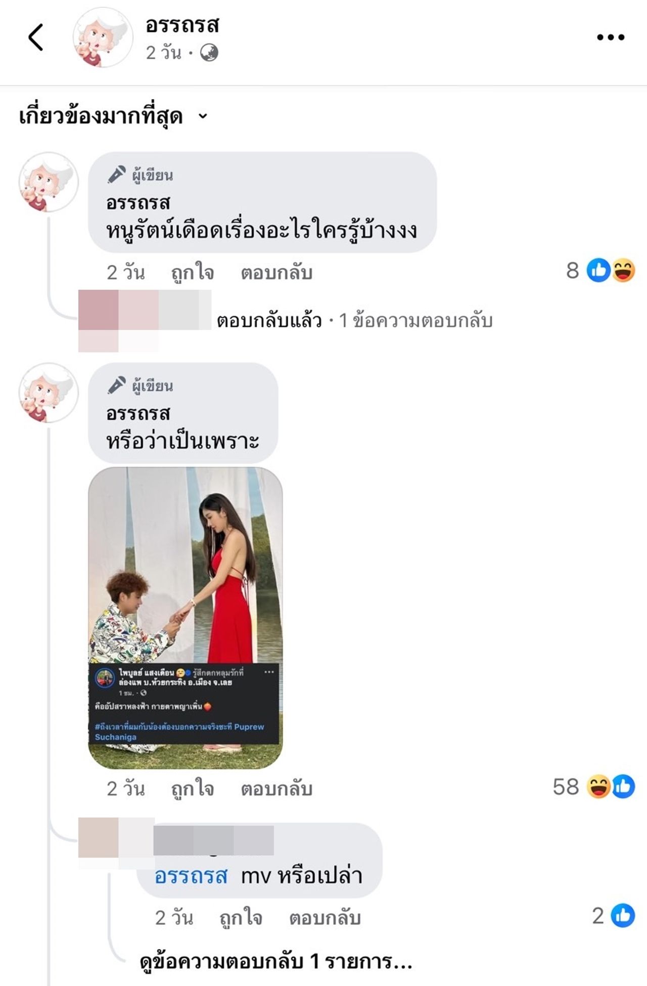 และเพจอรรถรสยังโพสต์ถามในคอมเมนต์อีกว่า “หนูรัตน์เดือดเรื่องอะไรใครรู้บ้างงง” และ “หรือว่าเป็นเพราะ” พร้อมทั้งโพสต์ภาพ ครูไพบูลย์ คุกเข่าต่อหน้า ปูเปรี้ยว ที่กลายเป็นประเด็นร้อน โดยมีชาวเน็ตแสดงความคิดเห็นมากมาย ด้านเพจบันเทิงดัง เจ๊มอย 108 V1 ก็เข้ามาคอมเมนต์ว่า “ไม่ผิดจากที่กูเล่า เจ้าชายกบกับราพันเซลเลย”