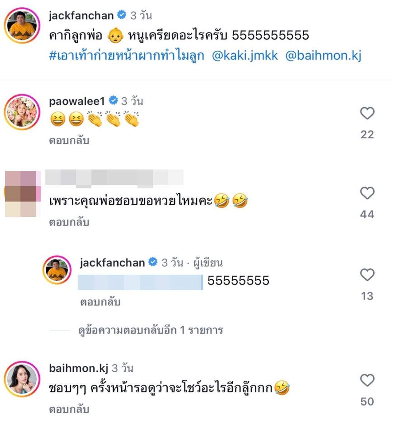 ด้าน ใบหม่อน กิตติยา ก็คอมเมนต์ว่า “ชอบๆๆ ครั้งหน้ารอดูว่าจะโชว์อะไรอีกลู๊กกก” ส่วนแฟนๆ ต่างเข้ามาแซว อาทิ เพราะคุณพ่อชอบขอหวยไหมคะ, คากิเครียด…งวดนี้จะให้เลขไรดี, หลานเล่นโยคะค่ะพ่อ, เครียดกับพ่อครับ คากิบอก, คากิฮาได้พ่อ, เครียดพ่อพูดไม่รู้เรื่อง ฯลฯ