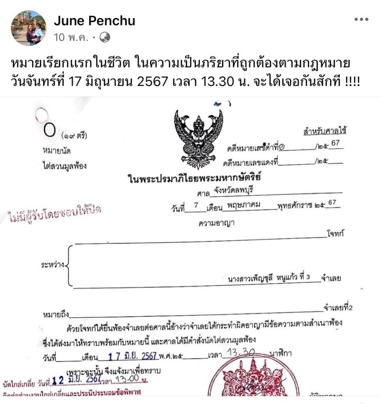 ซึ่งหลังจากที่ จูน เพ็ญชุลี ถูกฟ้อง เจ้าตัวก็ได้โพสต์ข้อความเมื่อวันที่ 10 พ.ค. 2567 โดยบอกว่า “ฟ้องแม่เหรอคะ ได้เลยค่ะ เดี๋ยวถึงวันนัดจะไปรอที่ศาลนะคะ จะได้เจอกันสักที” และ “หมายเรียกแรกในชีวิต ในความเป็นภริยาที่ถูกต้องตามกฎหมาย วันจันทร์ที่ 17 มิถุนายน 2567 เวลา 13.30 น. จะได้เจอกันสักที!!!!”