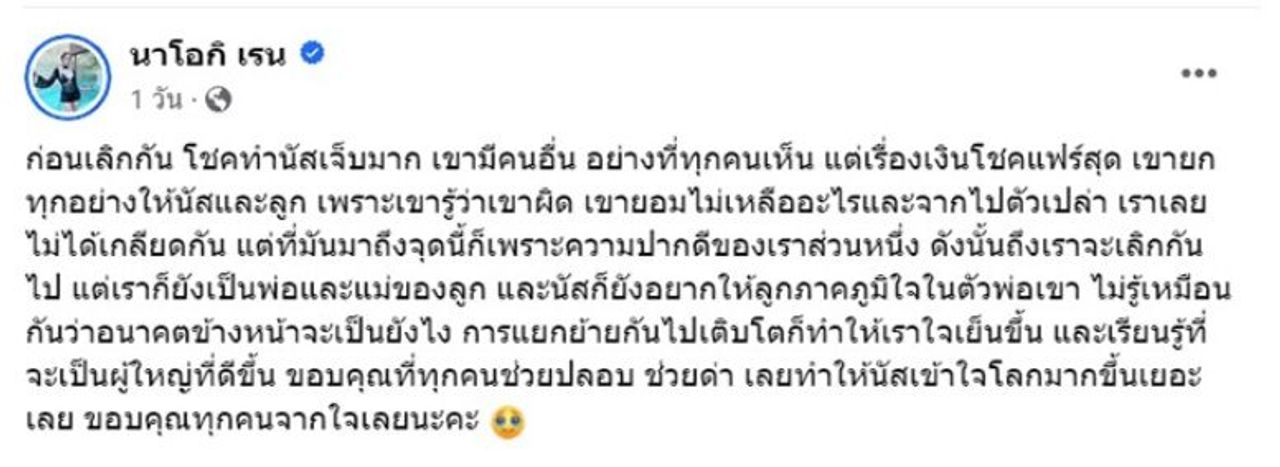 จริงๆ ก็ได้เจอกันอยู่แล้ว เขาก็ไปรับไปส่งลูก เขาทำหน้าที่พ่อได้ดีอยู่แล้ว ลูกจะอยู่เมืองไทยถึง 8 ขวบ แล้วจะส่งไปอยู่กับน้าเขาที่ออสเตรเลีย เขาก็เลยอยากทำหน้าที่ตรงนี้ให้ดีที่สุด เพราะเขากลัวไม่ได้เจอลูก”.