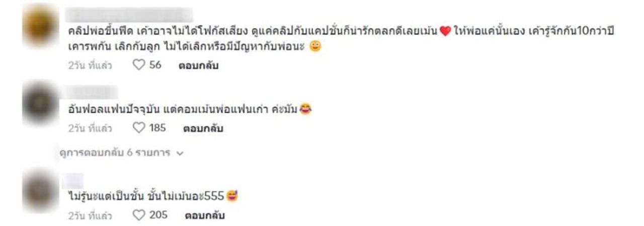 งานนี้ก็มีชาวเน็ตบางรายแคปภาพข้อความไปลงใน TikTok ทำให้เกิดกระแสวิจารณ์ บ้างก็มองว่าเขารู้จักกันมานาน เลิกกับลูกก็ไม่ได้เลิกหรือมีปัญหาอะไรกับพ่อ บ้างก็มองว่าคลิปกับแคปชั่นน่ารักก็เลยคอมเมนต์มากกว่า