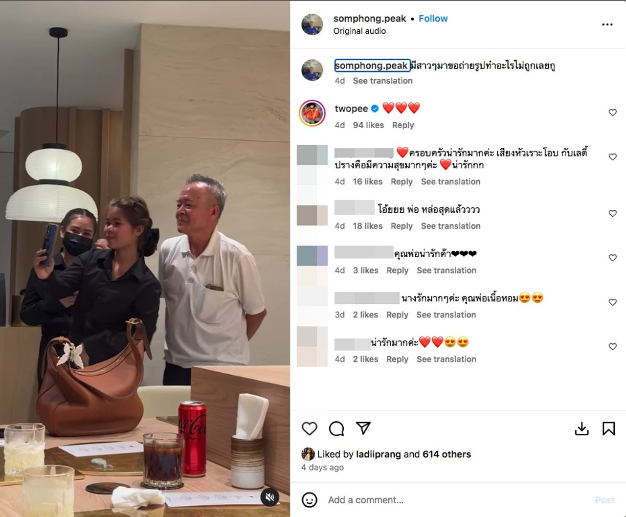 แต่ล่าสุดก็มีประเด็นที่ทำเอาชาวเน็ตถกเถียงกันซะแล้ว เมื่อคุณพ่อของ เลดี้ปราง ได้โพสต์คลิปวิดีโอตอนที่คุณพ่อกำลังถ่ายภาพกับแฟนคลับ พร้อมทั้งเขียนข้อความว่า “มีสาวๆ มาขอถ่ายรูปทำอะไรไม่ถูกเลยกู” และ โต้ง ทูพี ก็เข้ามาคอมเมนต์เป็นอีโมจิหัวใจ 3 ดวง