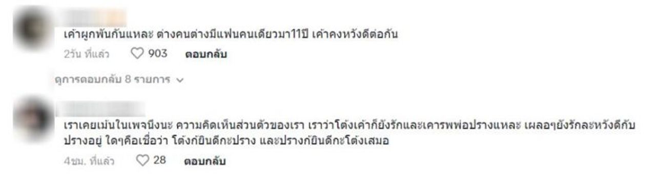 แต่ก็มีบางคนมองว่าอันฟอลโลว์ไอจีแฟนคนปัจจุบัน แต่คอมเมนต์พ่อแฟนเก่า บ้างบอกว่าถ้าเป็นตนเองจะไม่คอมเมนต์ ทำไมรู้สึกว่าทำแบบนี้เหมือนกำลังเสียดาย และมีบางคนก็โยงไปถึง พลอย และ โอบ ที่เป็นหวานใจคนปัจจุบันของทั้งคู่ด้วย.