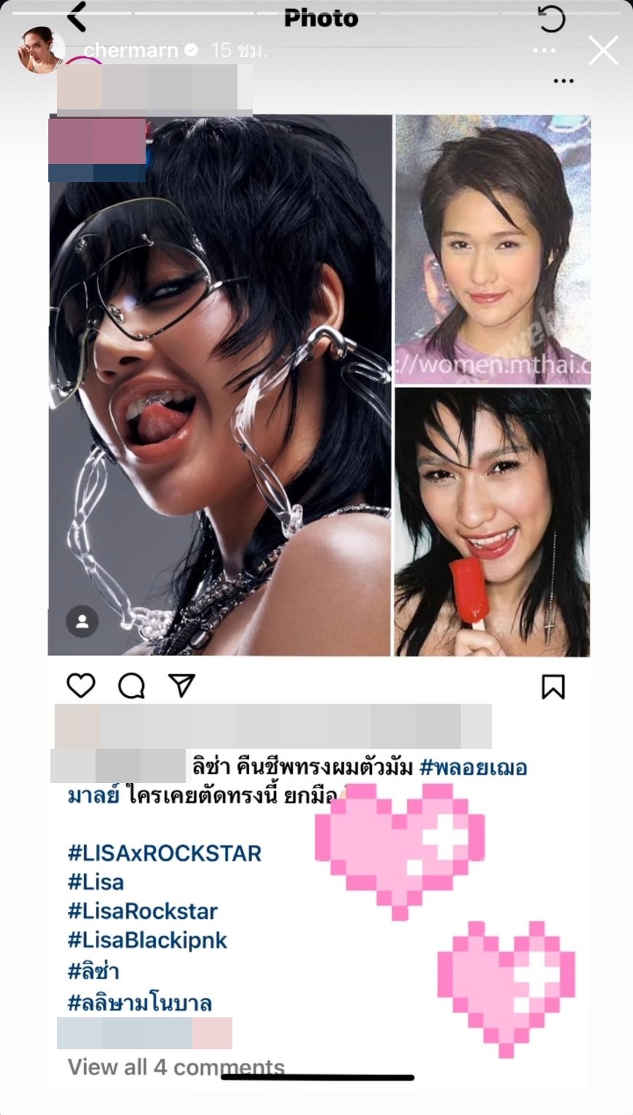 ซึ่ง พลอย เฌอมาลย์ ก็ได้แคปภาพเปรียบเทียบทรงผมรากไทรของตนเองกับ ลิซ่า ลงในไอจีสตอรี่ พร้อมทั้งใส่อีโมจิหัวใจอีกด้วย.