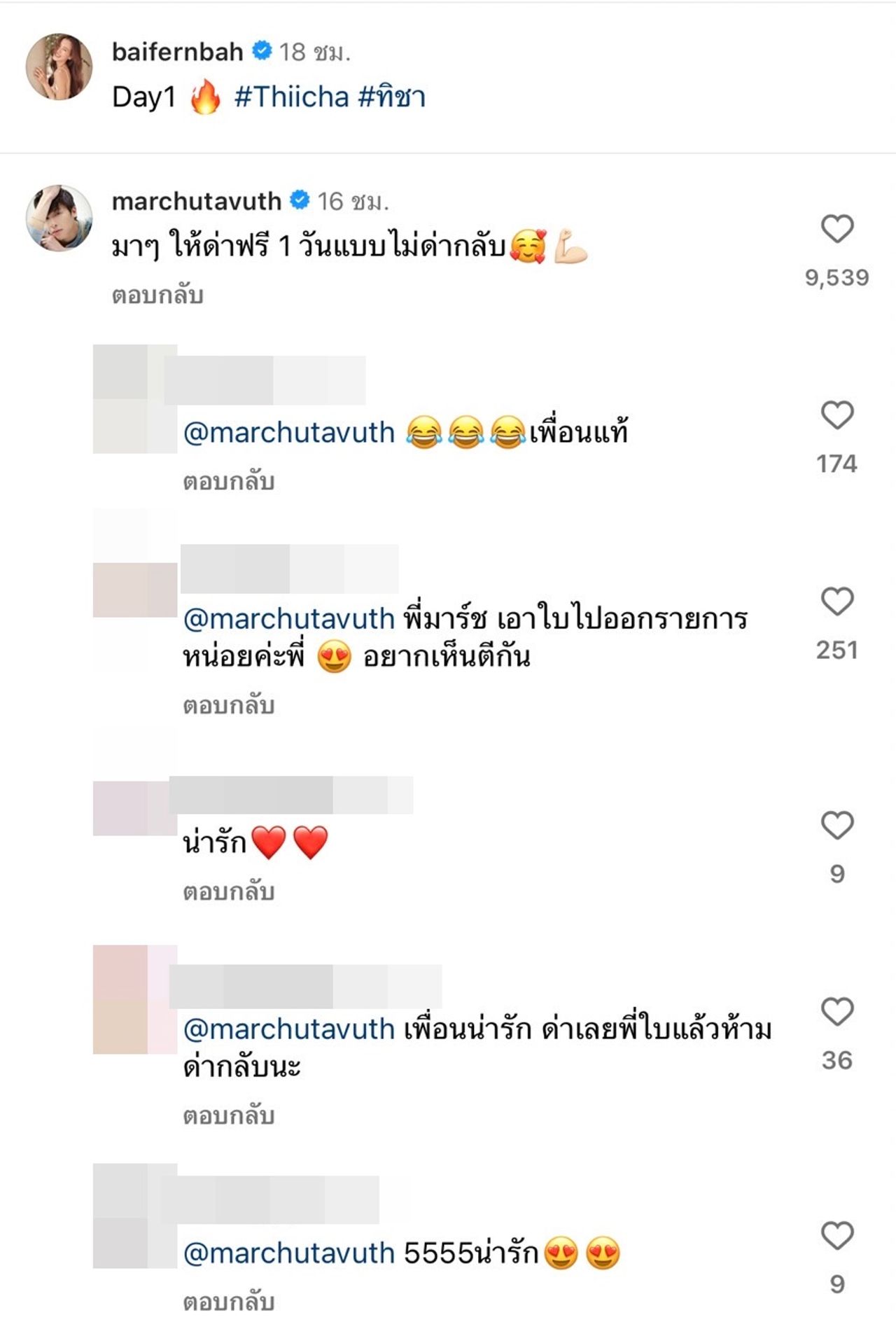 และหนึ่งในนั้นเป็นเพื่อนสนิทที่เป็นคู่จิ้นในตำนานอย่างพระเอกหนุ่ม มาร์ช จุฑาวุฒิ ภัทรกำพล ที่เข้ามาคอมเมนต์สั้นๆ ว่า “มาๆ ให้ด่าฟรี 1 วันแบบไม่ด่ากลับ” พร้อมทั้งใส่อีโมจิหน้ายิ้มหัวใจล้อมรอบและอีโมจิสตรอง