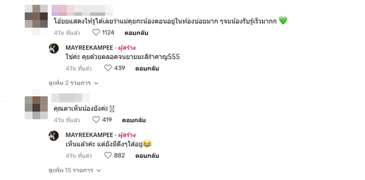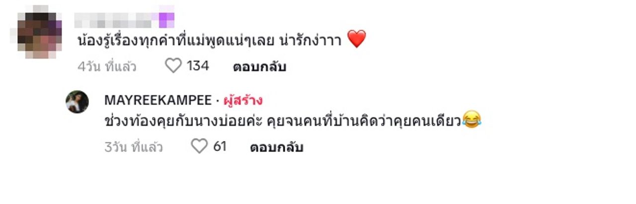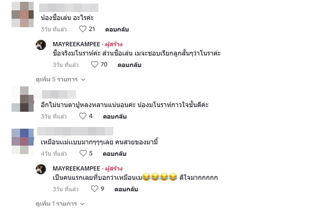 งานนี้แฟนๆ ต่างก็เข้ามาคอมเมนต์ อาทิ น้องชื่อเล่นอะไรคะ ซึ่ง เมรี ก็ตอบว่า “ชื่อจริงมโนราห์ค่ะ ส่วนชื่อเล่น เมจะชอบเรียกลูกสั้นๆ ว่าโนราค่ะ”, น้องรู้เรื่องทุกคำที่แม่พูดแน่ๆ เลย น่ารักง่าาา และ เมรี ตอบว่า “ช่วงท้องคุยกับนางบ่อยค่ะ คุยจนคนที่บ้านคิดว่าคุยคนเดียว”